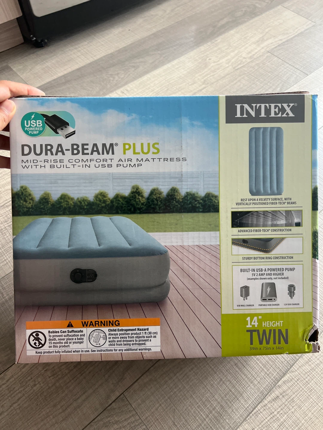 Selling an Intex Dura-Beam Plus mid-rise comfort air mattress with a built-in USB pump! It's a twin size, measuring 39in x 75in x 14in. The mattress has a sturdy bottom ring construction and advanced Fiber-Tech construction for a velvety surface.