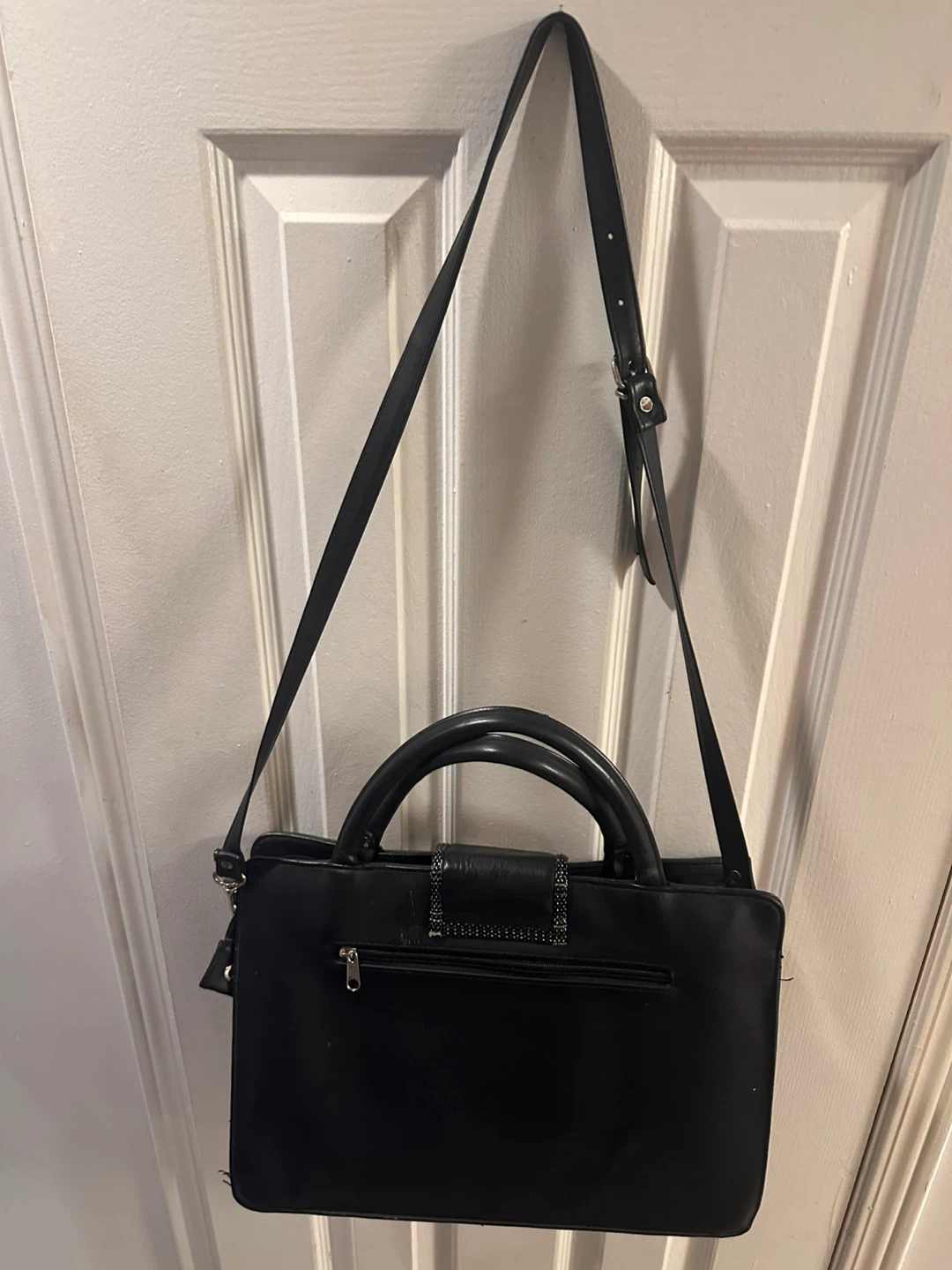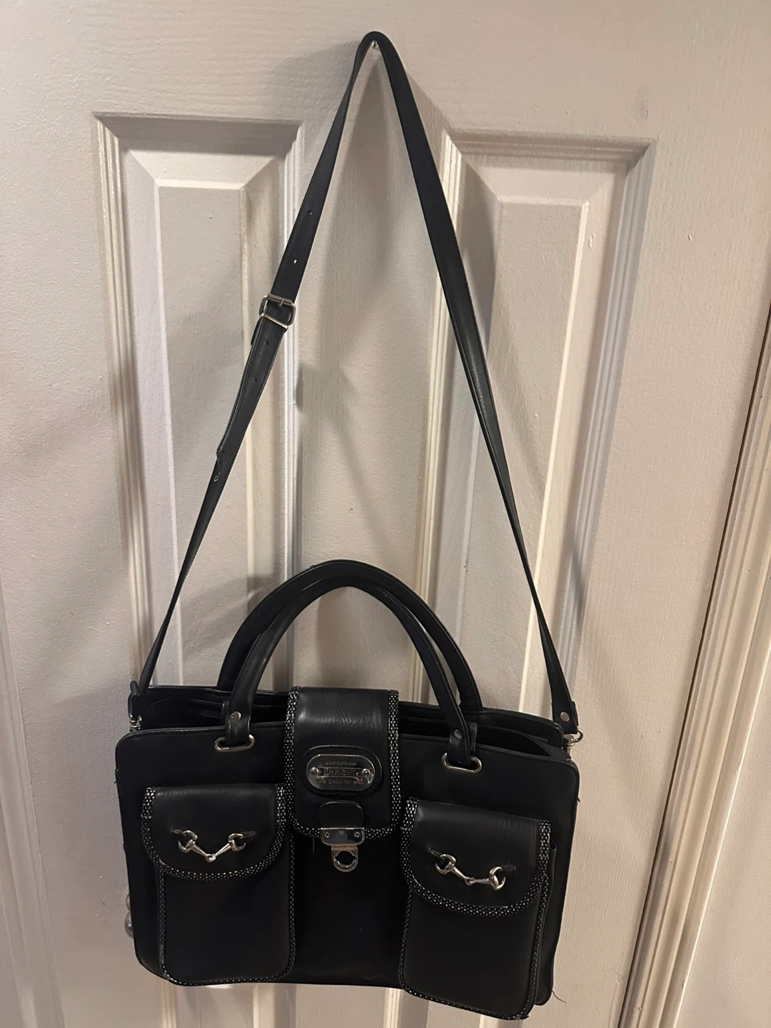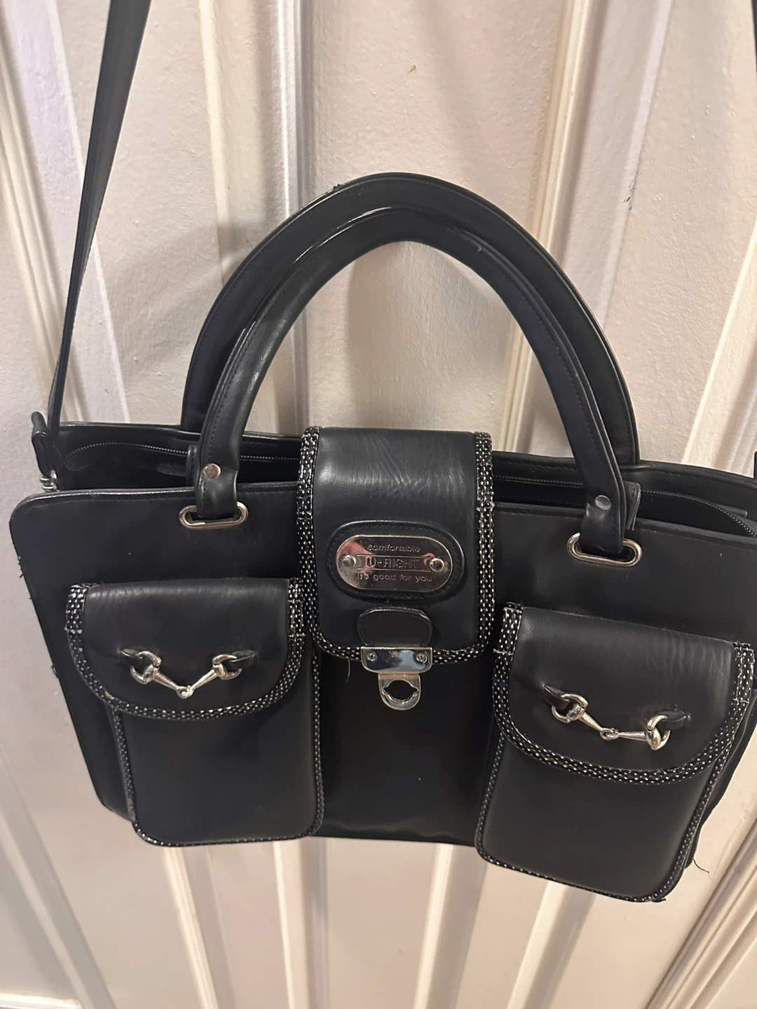 Selling a LuLu black leather handbag. It features a unique design with multiple pockets and a long strap for shoulder or crossbody wear. The interior is spacious and in good condition. Perfect for everyday use!