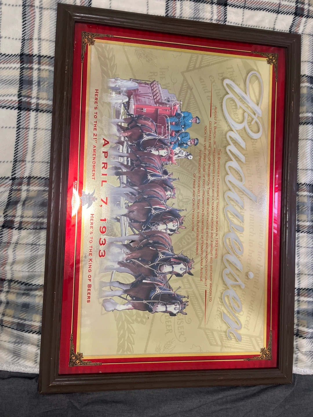 Selling a Budweiser mirror featuring the Clydesdales team and commemorating the 21st Amendment on April 7, 1933. It's a really cool piece for a bar area or a Budweiser collector!