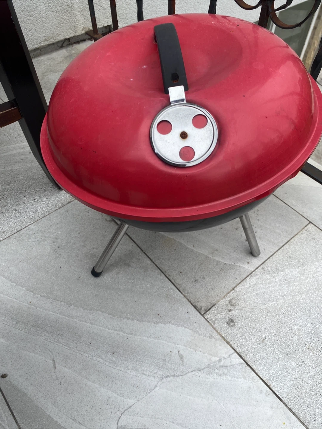 Selling a portable BBQ grill in red and black. It's perfect for small spaces like balconies or taking to the park. The grill is in good condition and ready for your next cookout. It features a lid and a grilling grate.