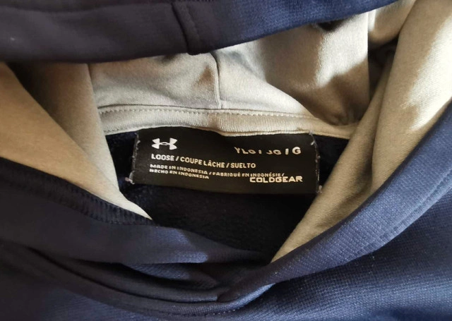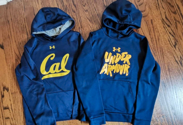 Two Under Armour hoodies with fleece lining, navy blue, size 10-11 years. Good condition, but one has some little scratches (see pictures). Price is for both hoodies.