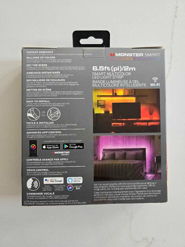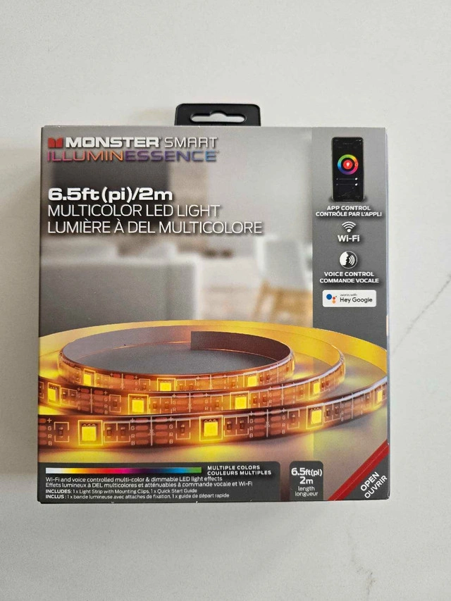 Monster Smart Illuminessence LED Light Strip - 2m (6.5 ft.). New in box, never used. Transform your room, or TV and computer setup with the Monster Smart Illuminessence LED light strip. With integrated Wi-Fi and voice control, it allows you to customise the light from anywhere through the Monster Smart app. Choose from multiple colours and dimmable light effects.