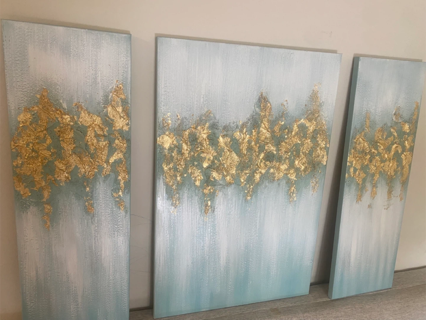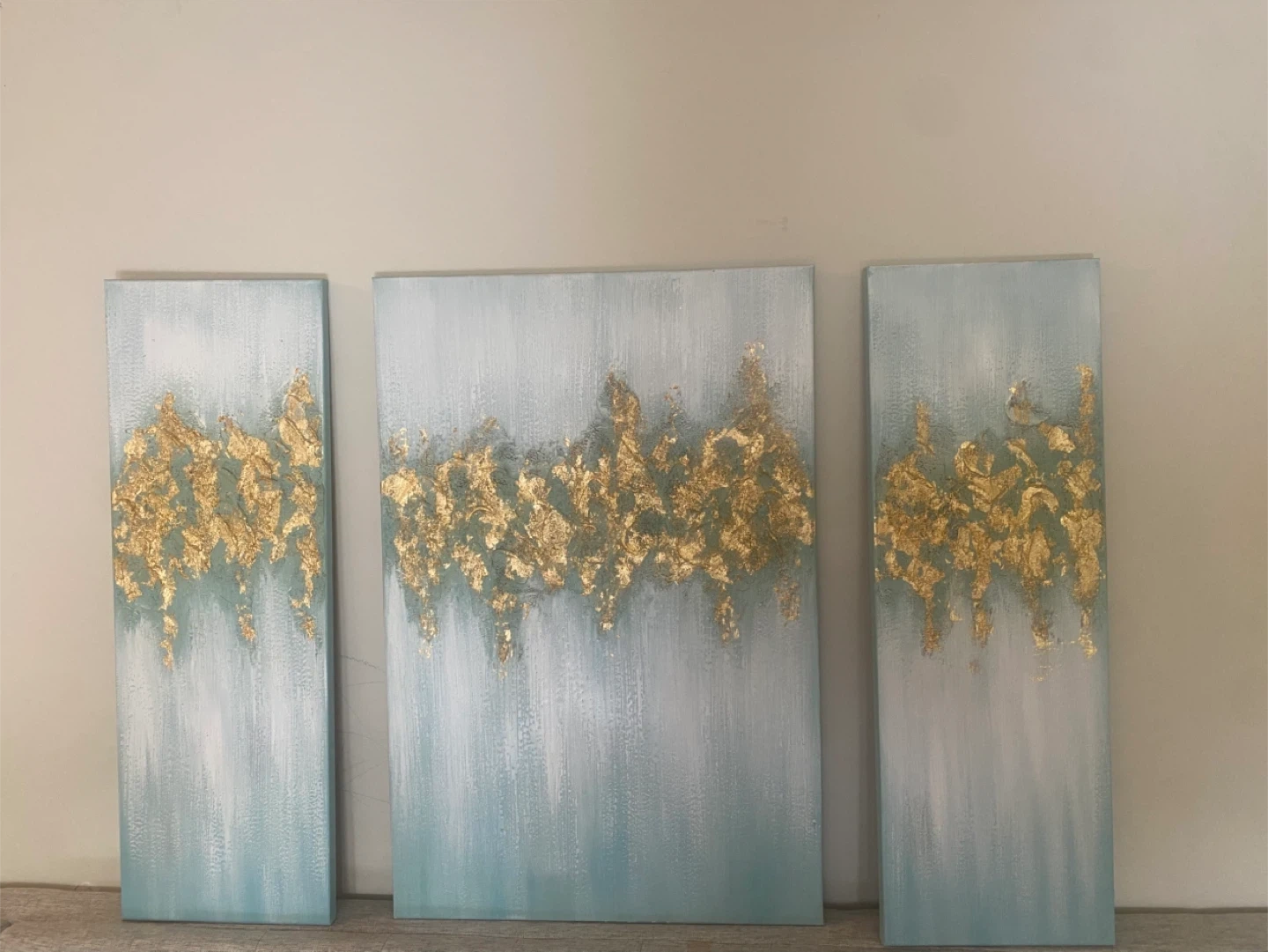 76Selling a beautiful set of three abstract wall art pieces. They feature a light blue background with textured gold leaf accents. Perfect for adding a touch of elegance to any room in your home!