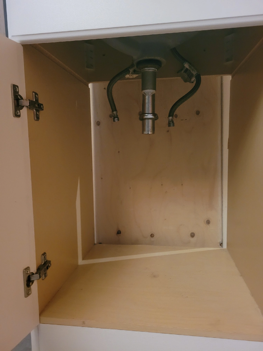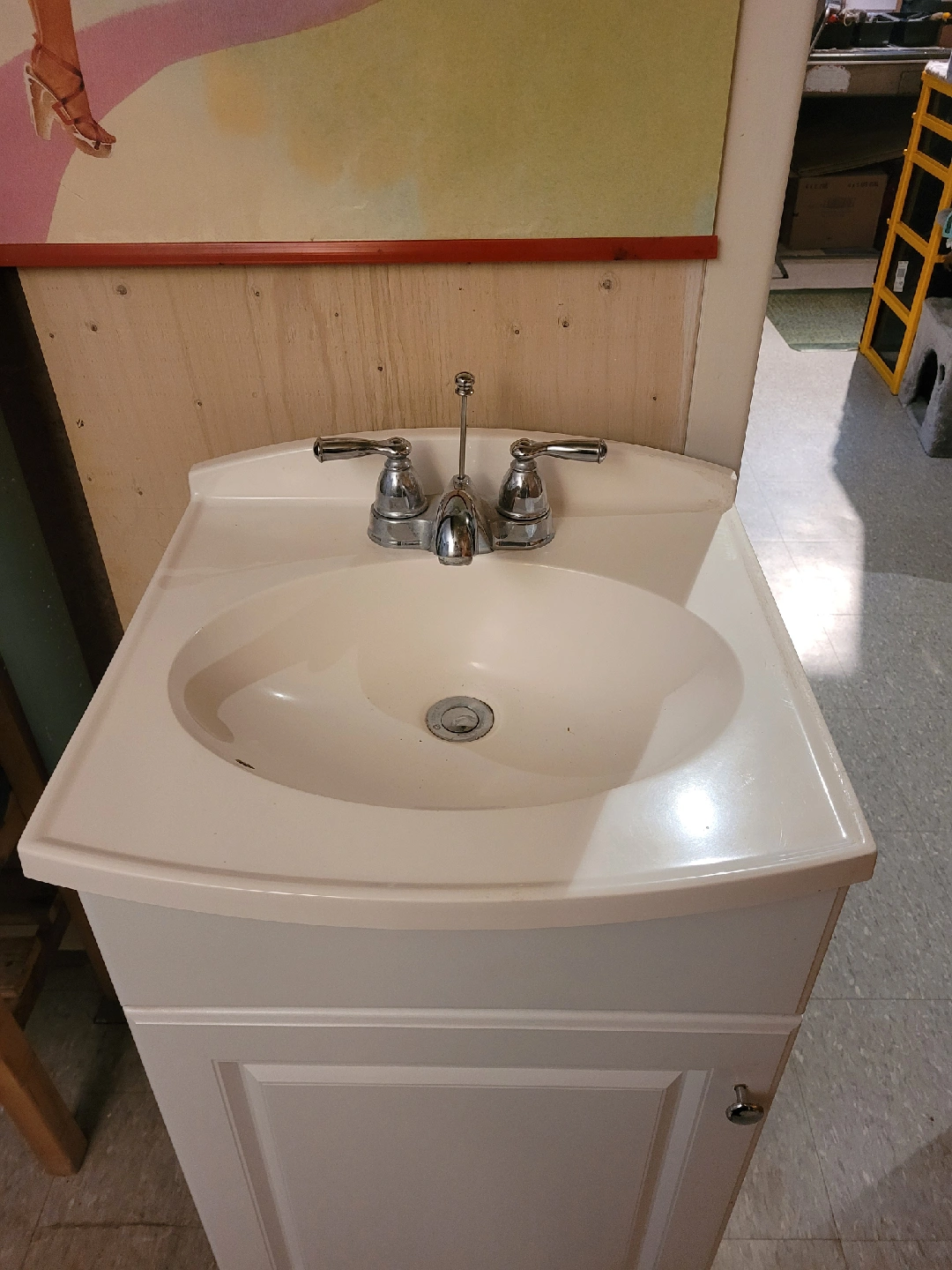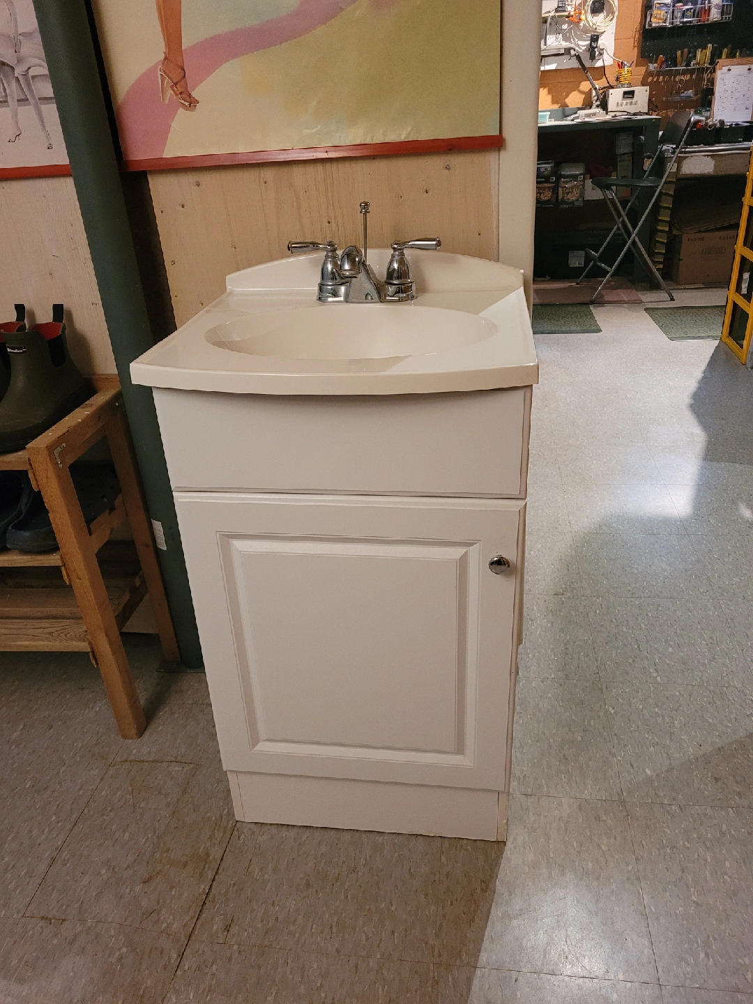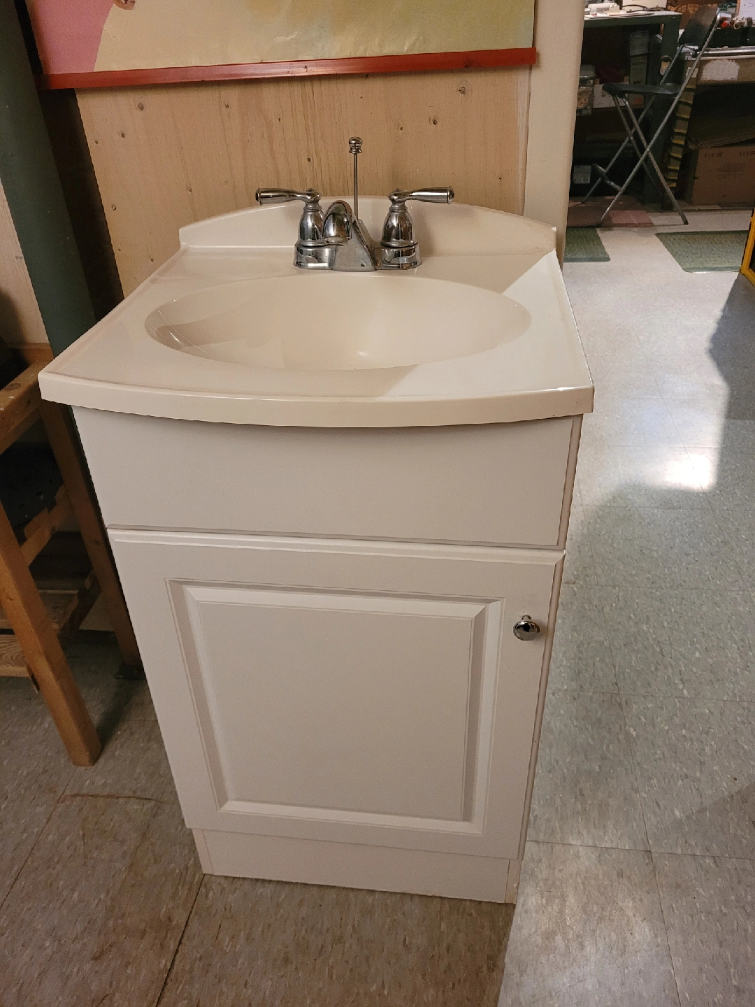 A small bathroom vanity with a sink and faucet. It's in great condition and ready to be installed. Perfect for a small bathroom or powder room! The vanity is white and features a single-door cabinet for storage underneath Size: 19W x 17.5D x 32H It is very rare size to find.