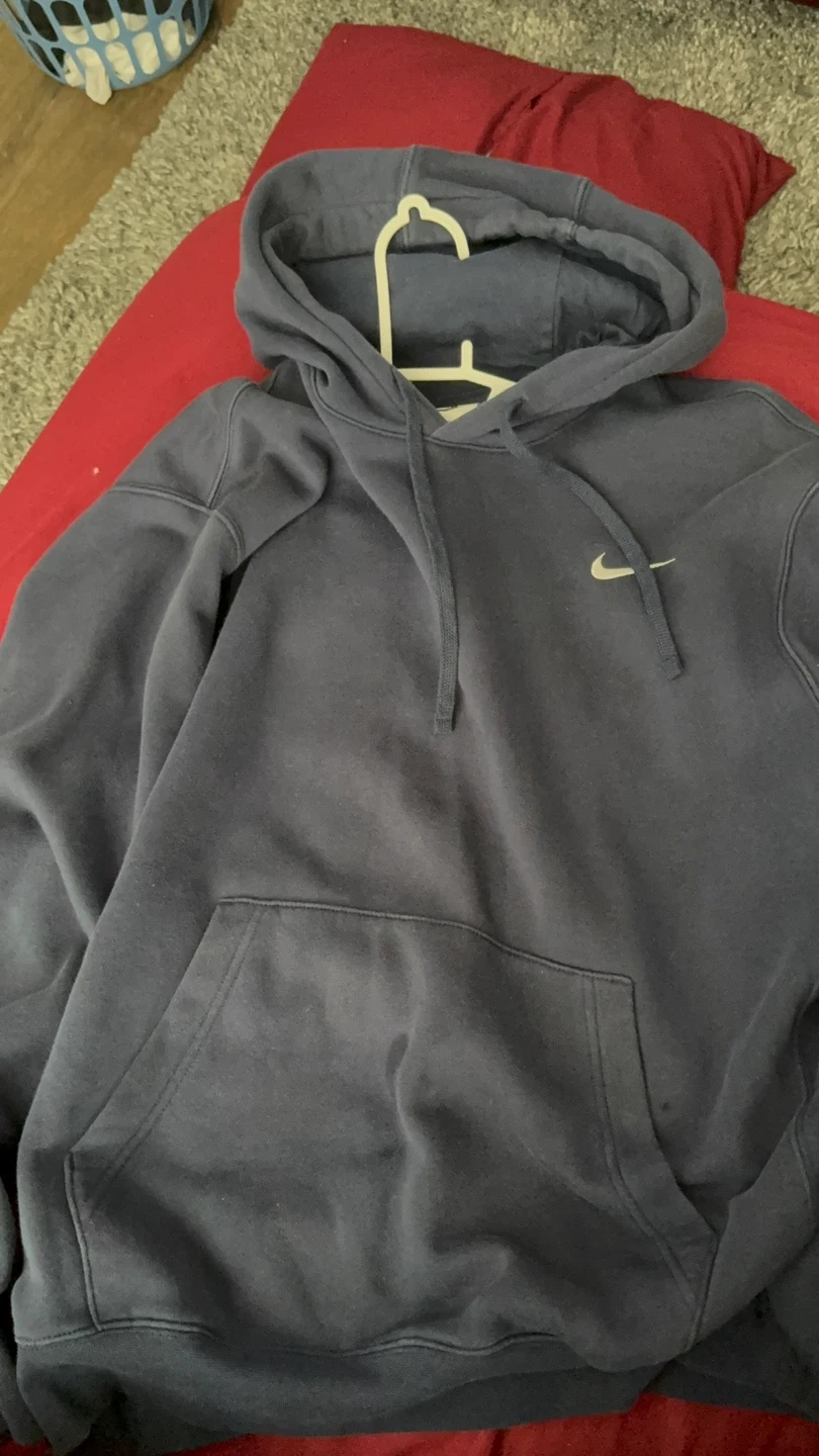 Selling a Nike hoodie. It's a nice nabyblue colour. There are some signs of wear, as pictured, but it's still in good condition and super comfy
