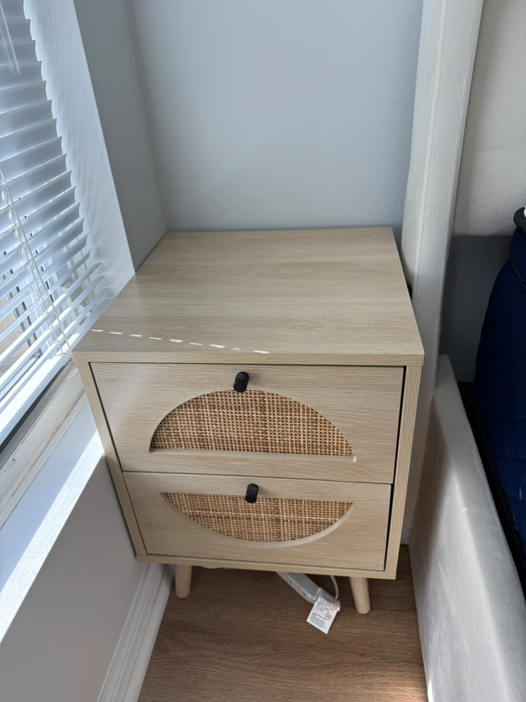 Here's a cute rattan nightstand with two drawers! It's in great shape and would look lovely in any bedroom. The light wood tone is neutral and goes well with all kinds of decor. The drawers provide ample storage for your bedside essentials