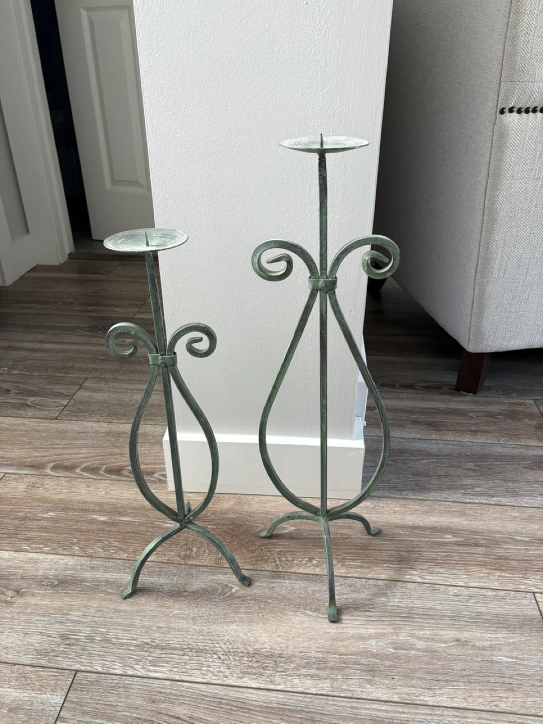 20Selling a pair of decorative metal candle holders. They have a lovely, rustic green finish and a unique, swirling design. Perfect for adding a touch of elegance to any room!
