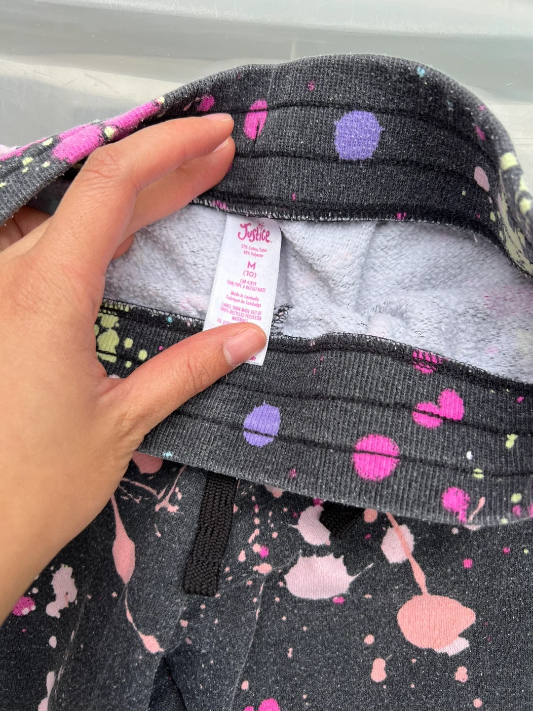 32Justice girls' outfit, size M (10). The set includes a hoodie and matching pants, both featuring a fun, colourful splatter paint design on a black background. The hoodie has the Justice logo on the front, and the pants have an elastic waistband with a drawstring for a comfy fit