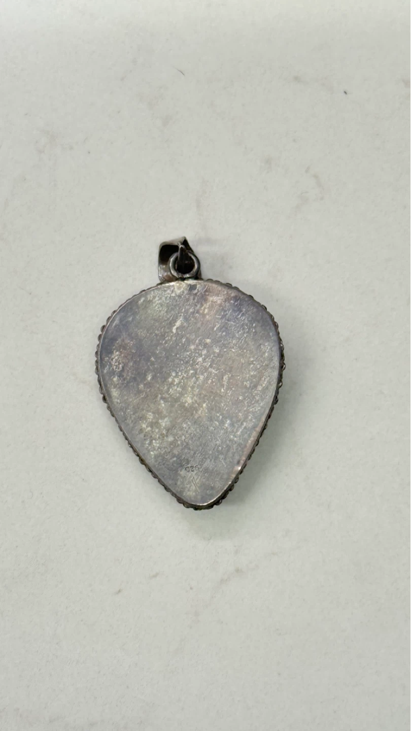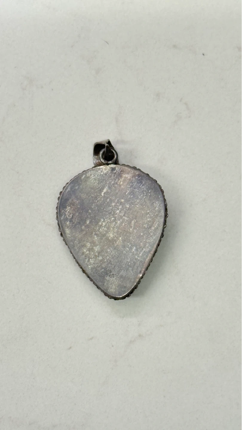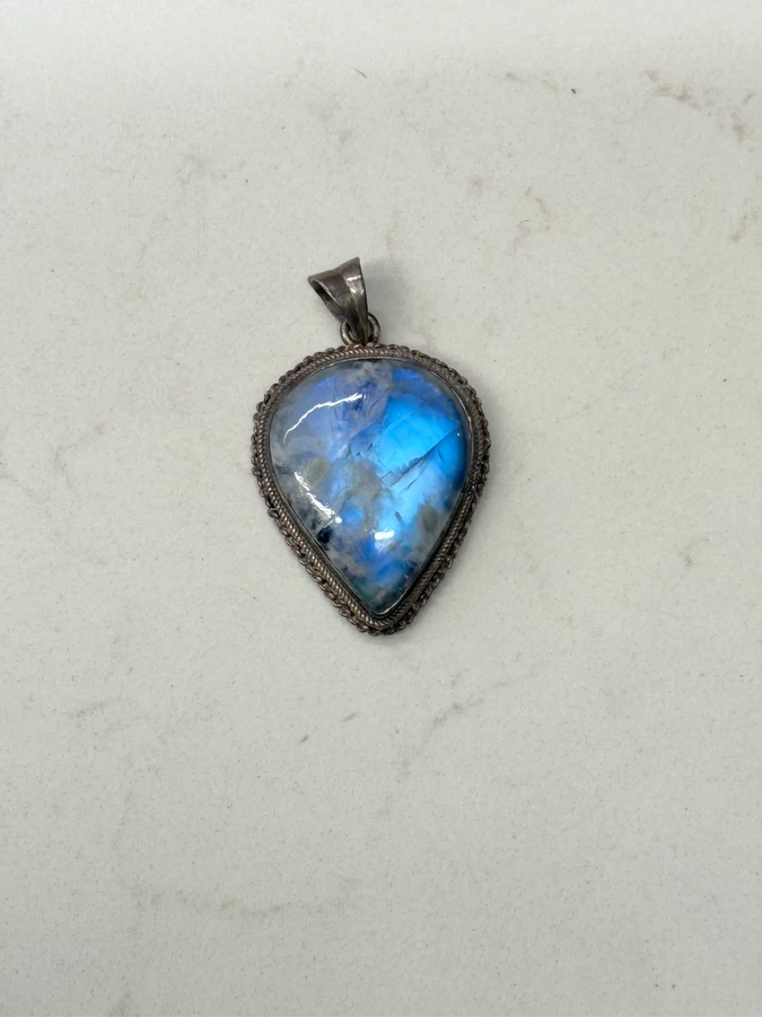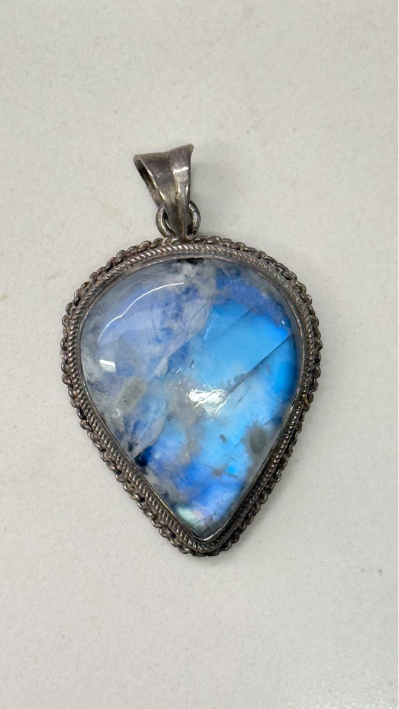 Selling a vintage moonstone pendant. It features a teardrop-shaped moonstone with a beautiful blue sheen, set in a detailed sterling silver setting and frame.