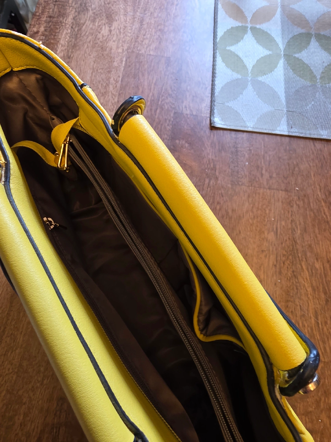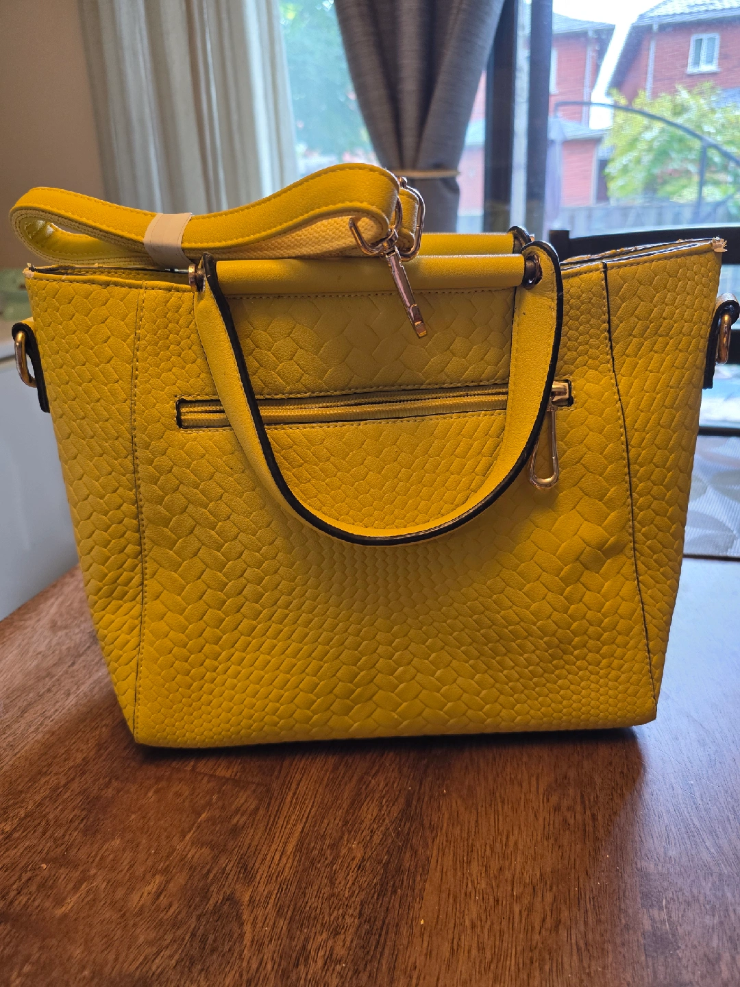Looking to sell this stylish yellow handbag! It features a unique snake print design and has both handles and a shoulder strap. The interior is lined with a dark fabric and includes a zippered pocket for your valuables. It's in great condition and ready for a new home
