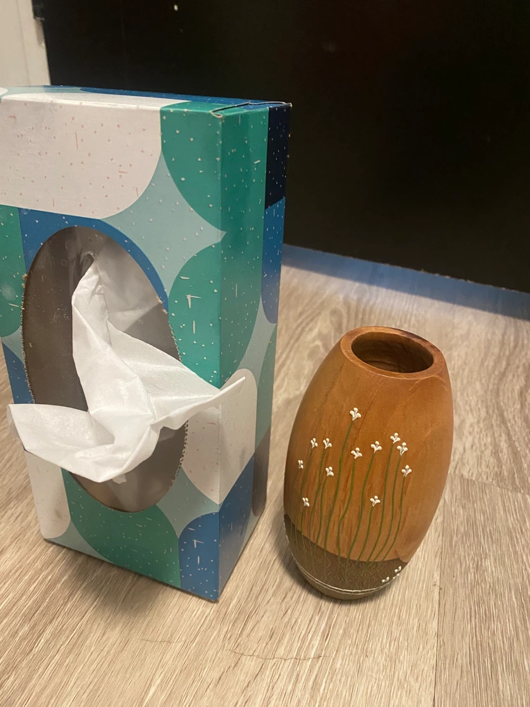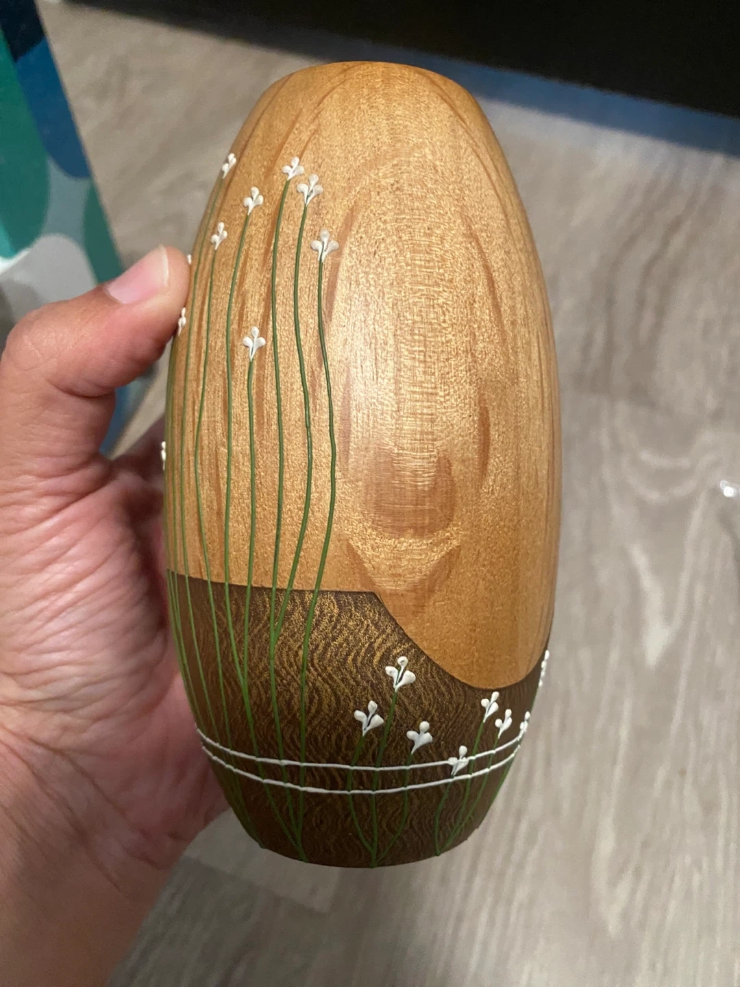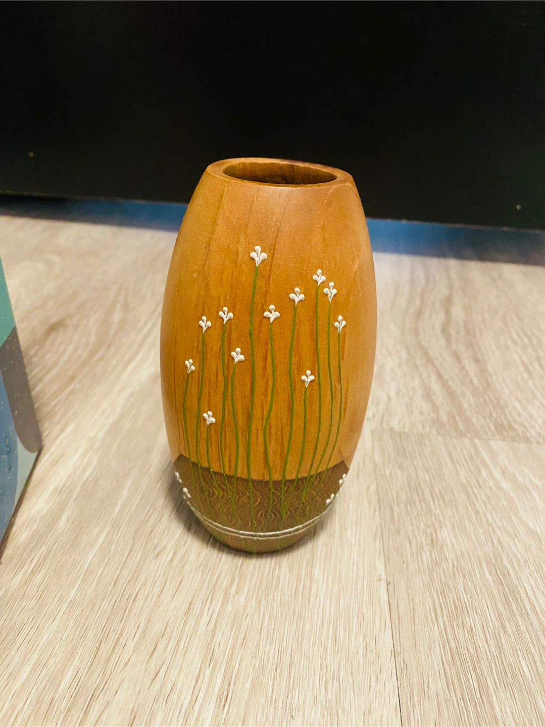 A cute wooden small vase, perfect for displaying flowers or as a decorative piece! It has a lovely floral design painted on it, adding a touch of nature to any room.