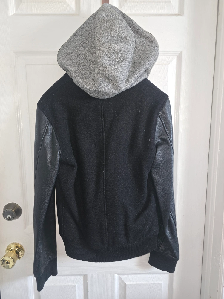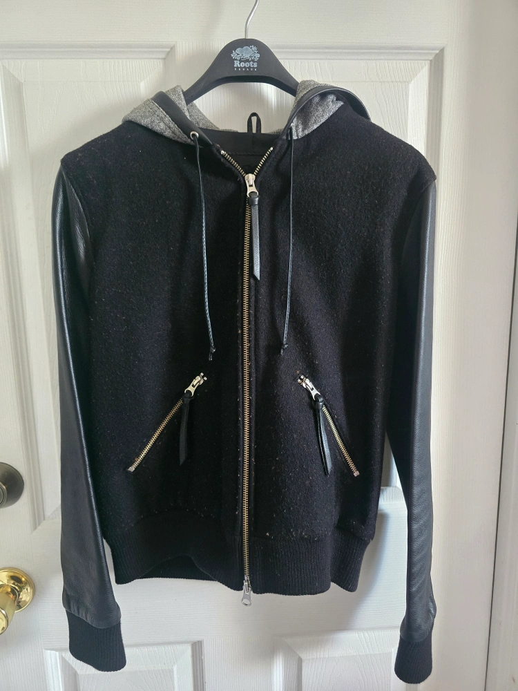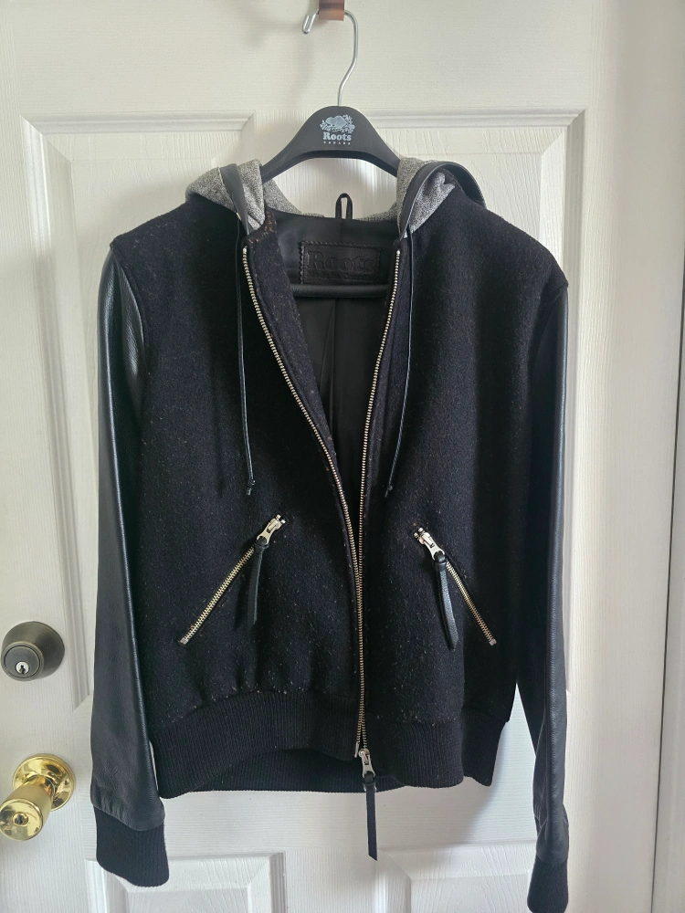 10Here's a stylish Roots jacket that would be a great addition to your wardrobe! It features a black wool body with leather sleeves and a grey hood. Perfect for those cooler days! Meet up ONLY