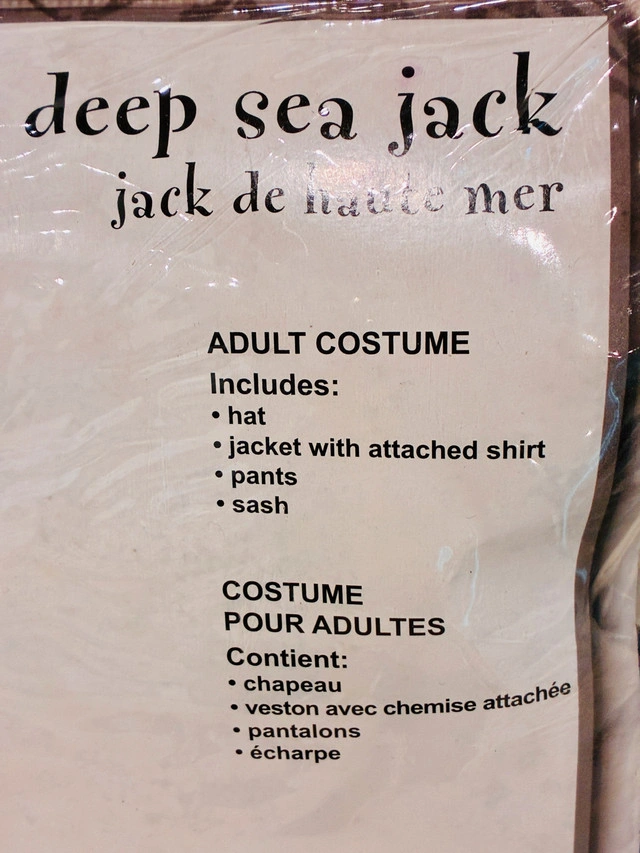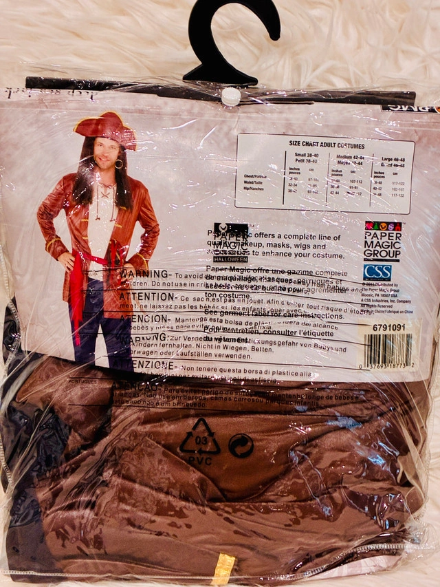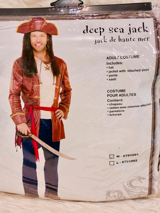 10Unworn! "Deep Sea Jack" (Jack de Haute Mer) Pirate Outfit - Adult Medium. Ahoy, matey! Grab this complete, striking Deep Sea Jack pirate costume! It features a realistic, distressed brown faux-leather jacket with an attached shirt, a matching hat, pants, and a red sash. Note: The sword shown on the model is NOT included, but the rest of the outfit is complete! Fixed price. Please checkout other costumes in my other post.