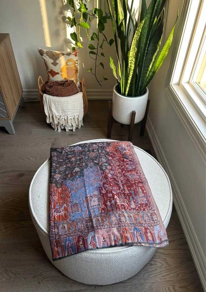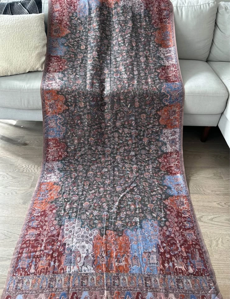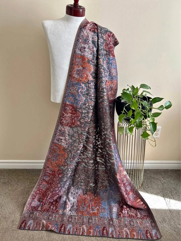 Kani Moonlight Shawl, made from soft woollen pashmina and featuring a luxurious gold effect. The shawl boasts a beautiful Mughal design border, perfect for adding a touch of elegance to any outfit.