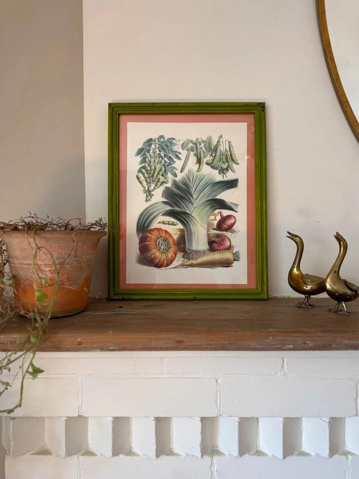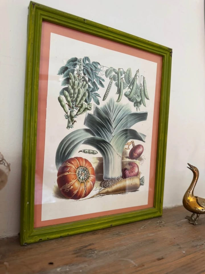 Rare 1883 Vilmorin Andrieux Botanical Vegetable Print in Distressed Green Frame. Frame Dimensions: 12.25” x 13.75”. Check out my profile for other vintage framed Vilmorin Andrieux Botanical Vegetable Print. Happy to give a discount for multiples. Charming framed art print perfect for a kitchen, dining room, or gallery wall! Features a vibrant, original vintage-style botanical illustration by the renowned French seed company Vilmorin Andrieux & Co, dating back to 1883! This print, titled "No34 - Squash Leek Peas Onion Carrot," showcases their exquisite detail and artistry. A true piece of agricultural and botanical history from Paris. The art is highlighted by an orange-red inner mat and a unique, distressed apple-green wooden frame. Ready to hang! Artist: Vilmorin Andrieux & Co (French Seed Company, Paris) Created: 1883 Original Title: No34-1883 Squash Leek Peas Onion Carrot Good vintage condition. Wear consistent with age.