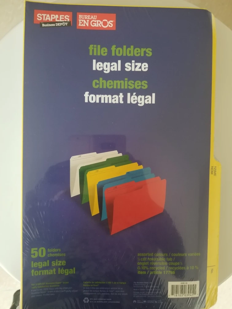 Selling a pack of Staples file folders, legal size. There are 50 folders in assorted colours. They are 10% recycled material, item number 17766