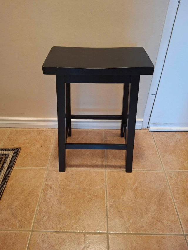 These are a pair of used black bar stools, perfect for adding seating to your kitchen island or bar area. Each stool features a sleek, simple design. While these stools have been previously loved, they remain sturdy and functional. They're still in great shape with sturdy wooden construction, a classic black finish and a comfortable seat. If the ad's still up, it means these stools are still available!