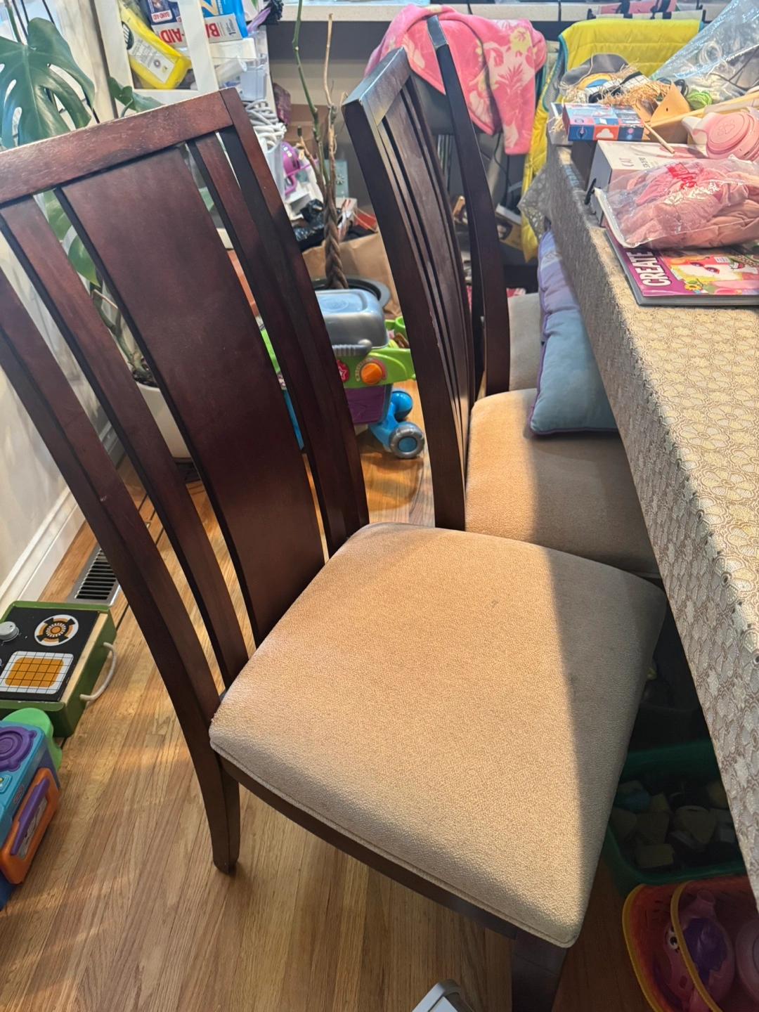 15They are in great condition (like new) and would look great in any dining room or kitchen! The chairs have a dark wood finish and neutral-coloured cushioned seats. 6 chairs Never been used other than to put stuff on top Reg price $1499