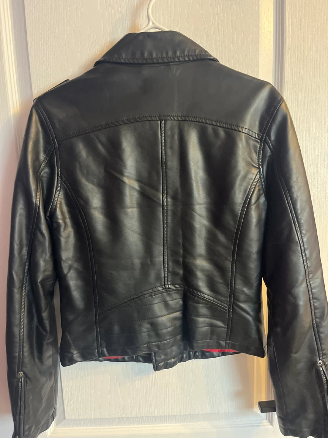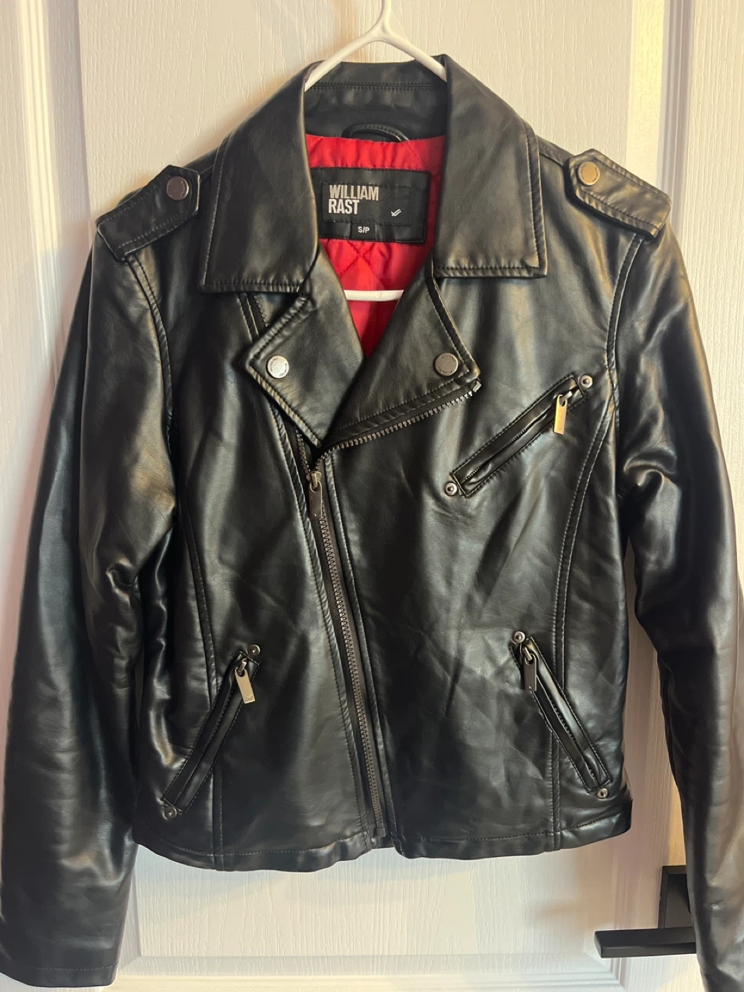 Selling a stylish William Rast black leather jacket in size S/P. It's in great condition and features a cool, edgy design with zipper details. The jacket has a red lining that adds a pop of colour. Pet and smoke free home. Pick up in Stittsville.