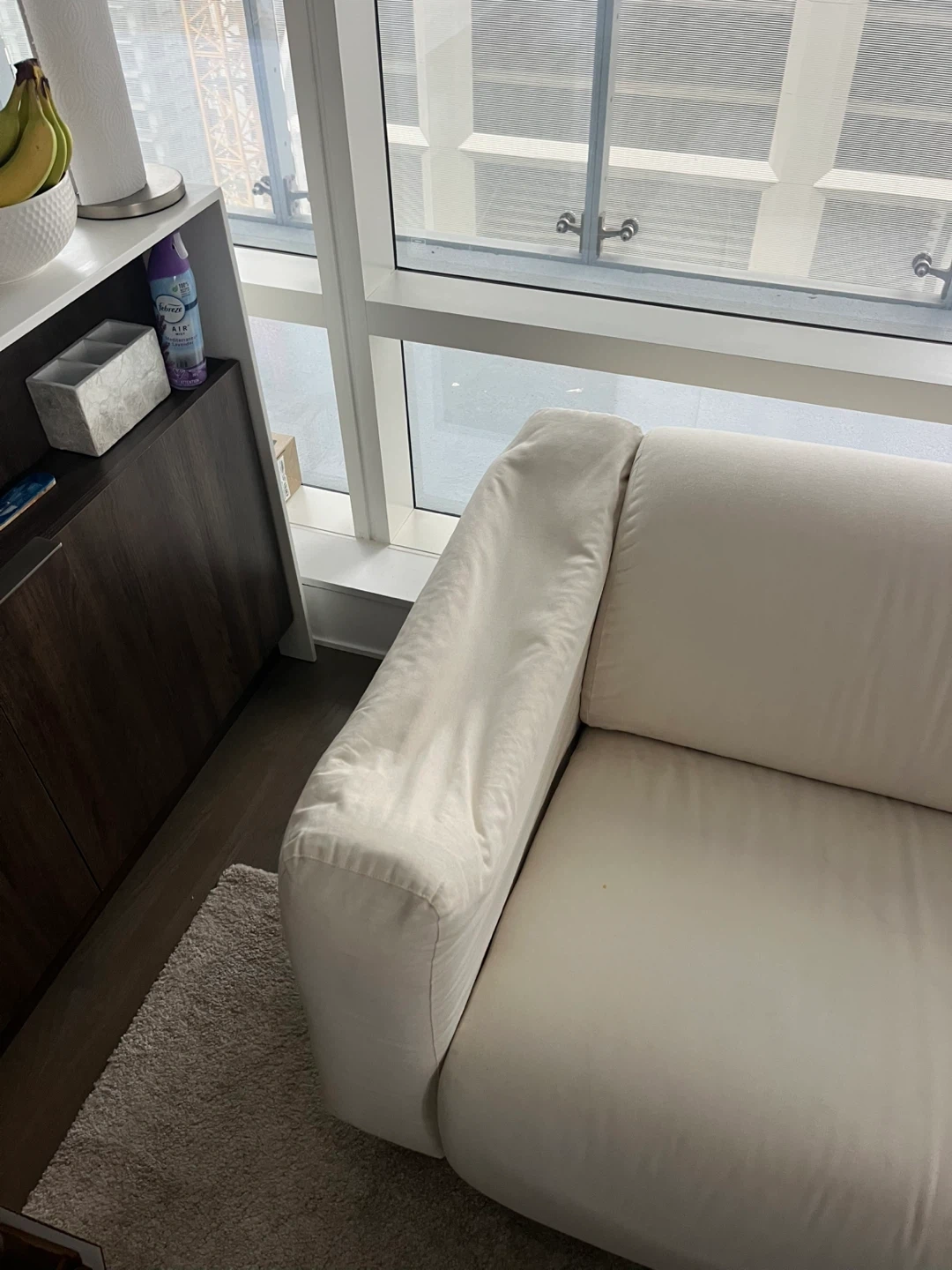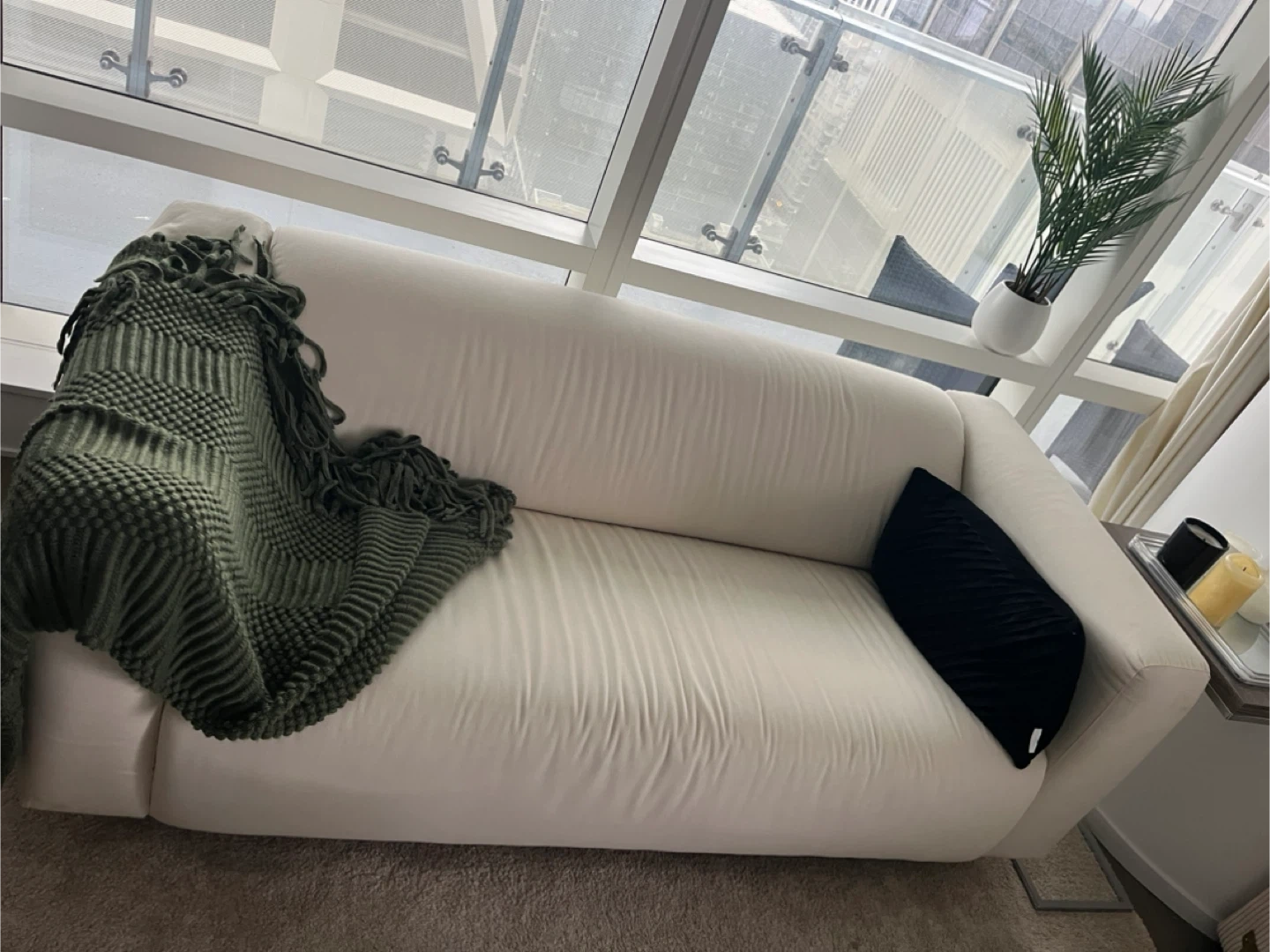 Selling a white sofa. It's in great condition but one of the arms is broken (I assume fixable). The sofa is comfortable and stylish, perfect for relaxing or entertaining guests