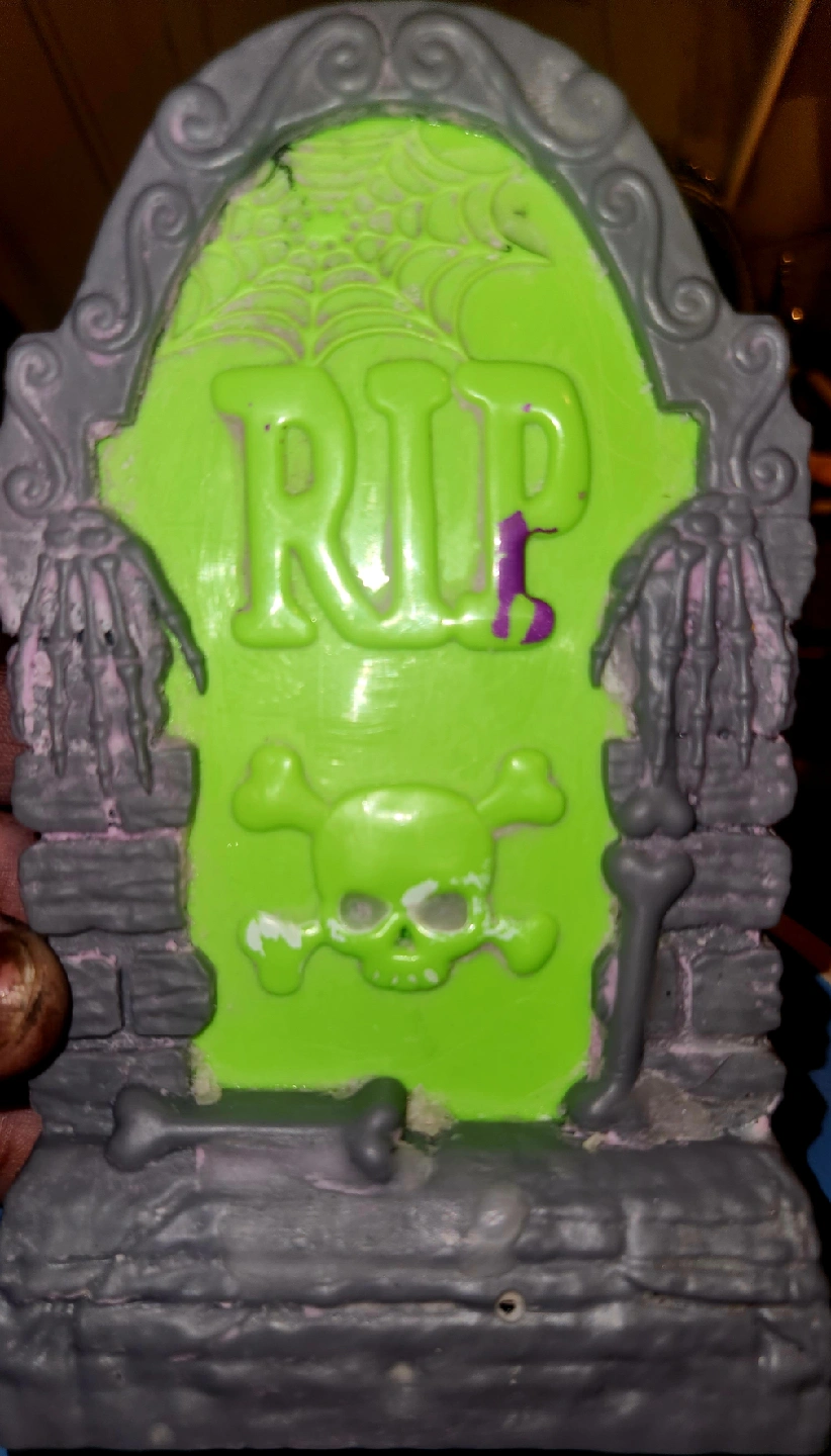 +Selling a Halloween tombstone decoration. It features a skull and crossbones design with skeleton hands on either side. Perfect for adding a spooky touch to your Halloween decor!