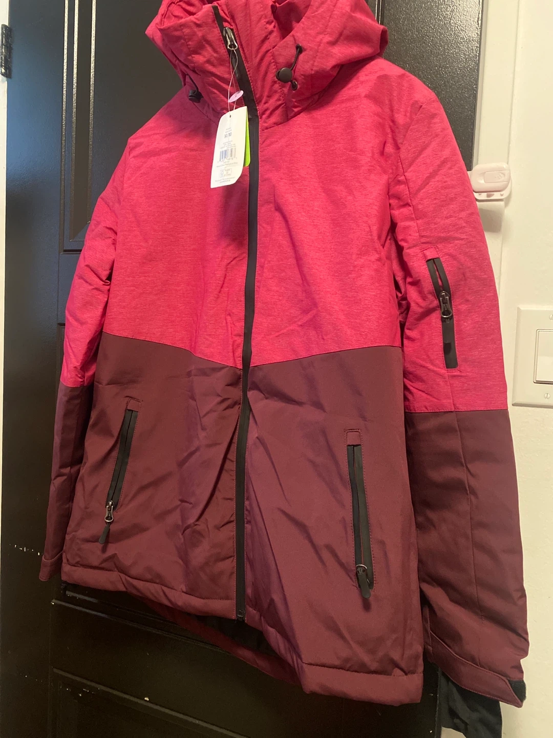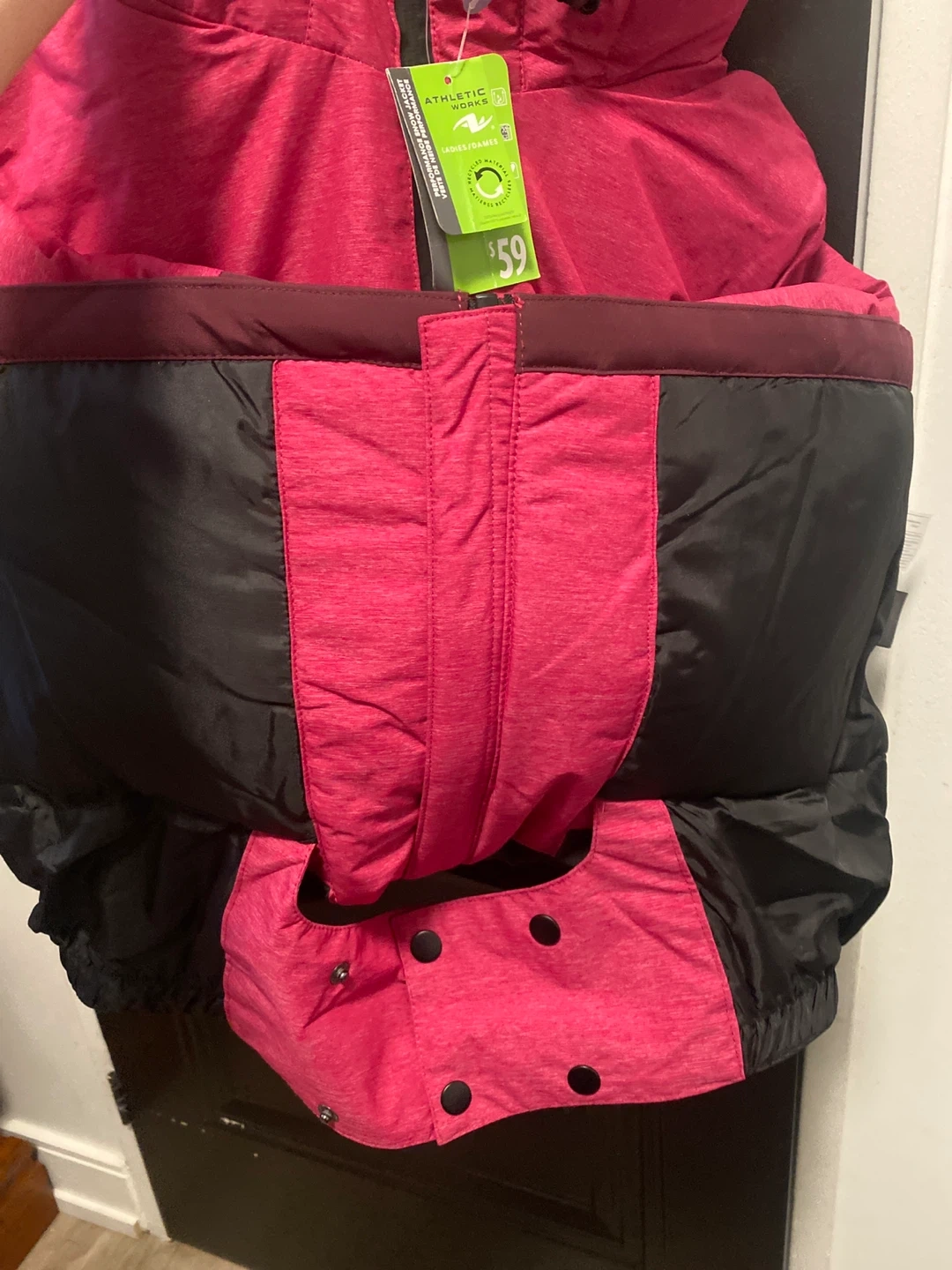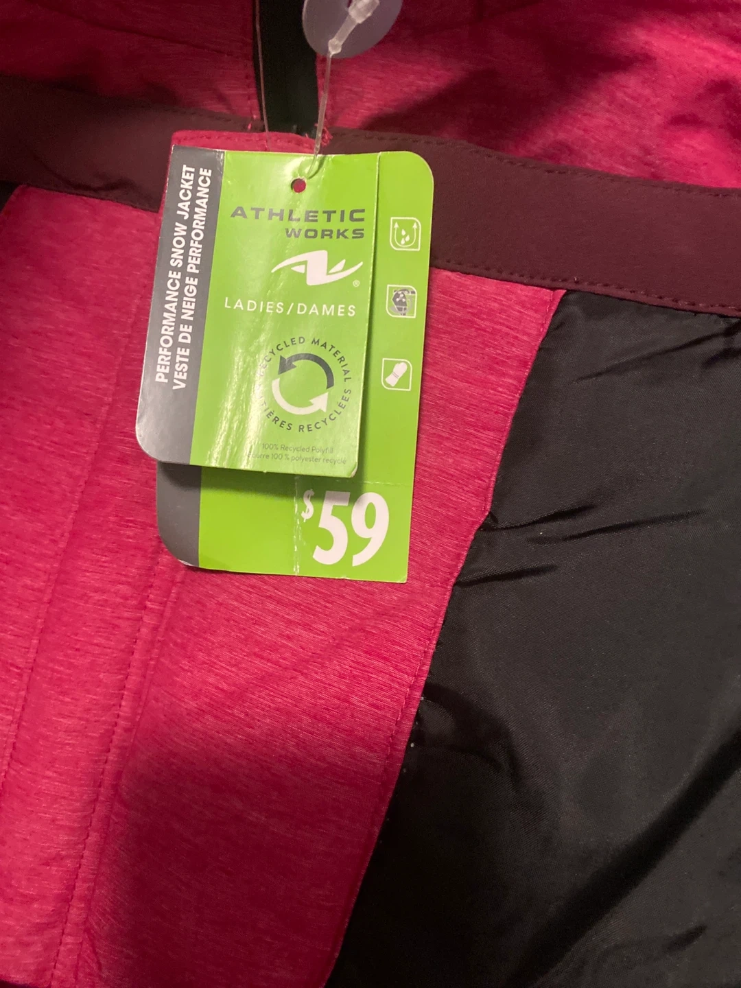 I'm selling a brand new Athletic Works performance snow jacket! It's a ladies size M/M and features a stylish pink and Burgundy design. The jacket is made with recycled materials and originally retailed for $59. Perfect for staying warm and dry this winter season.