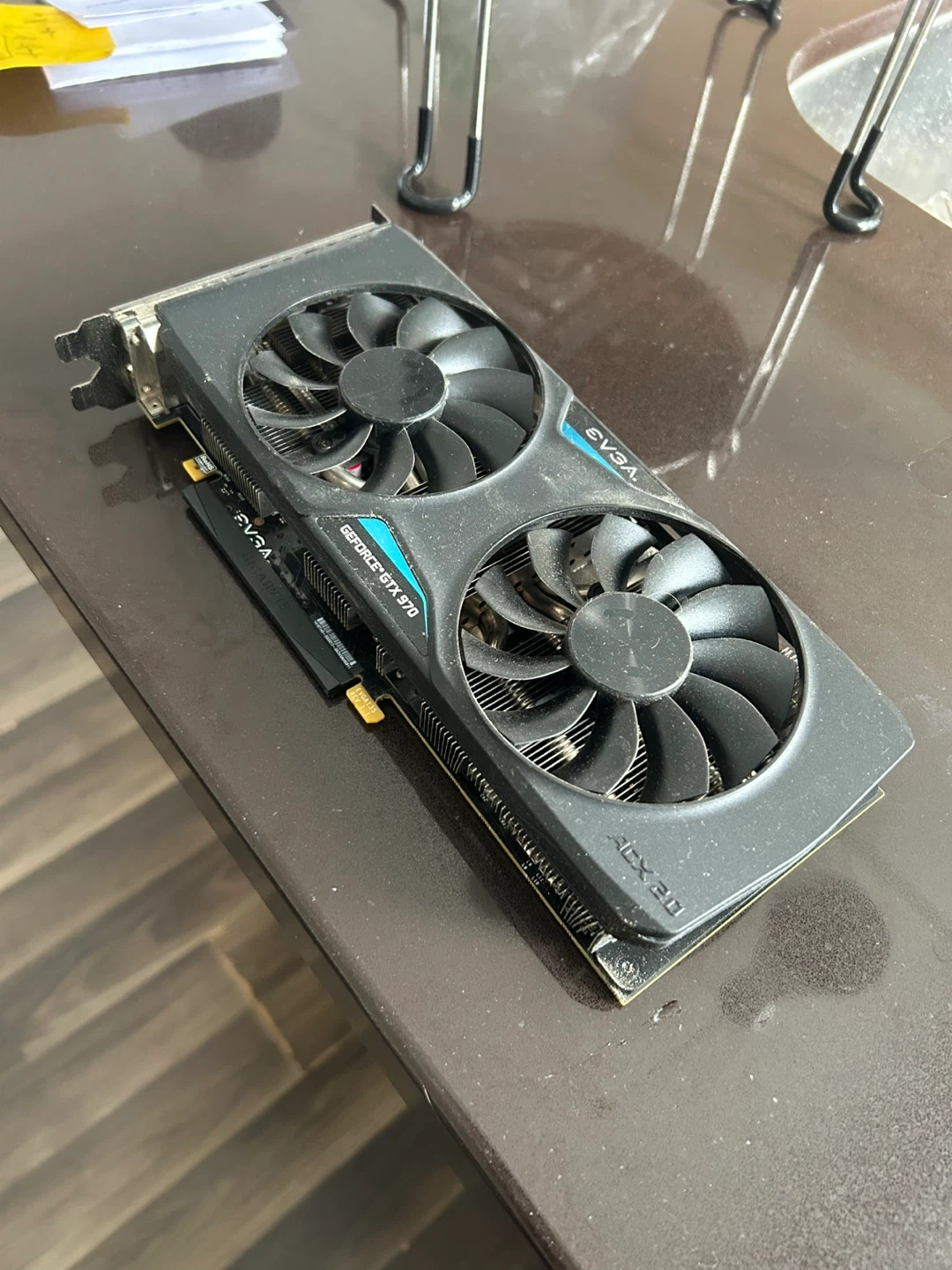 Selling an EVGA GeForce GTX 970 graphics card. It's in good working condition and ready to boost your gaming experience! It has a dual-fan cooling system to keep things running smoothly. If you're looking for a reliable graphics card, this could be a great option for you