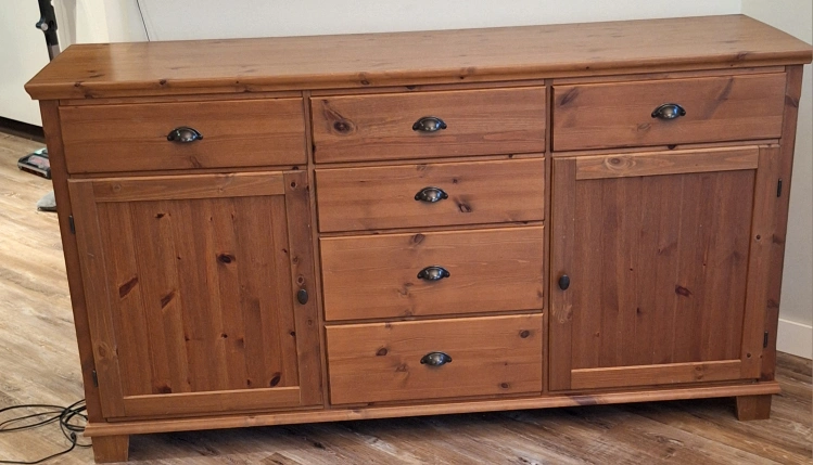 Here's a beautiful pine wood buffet or sideboard, perfect for adding storage and style to your dining area or living room! It features a warm, natural finish and plenty of space for dishes, linens, or other items. It's in great condition and ready for a new home!
