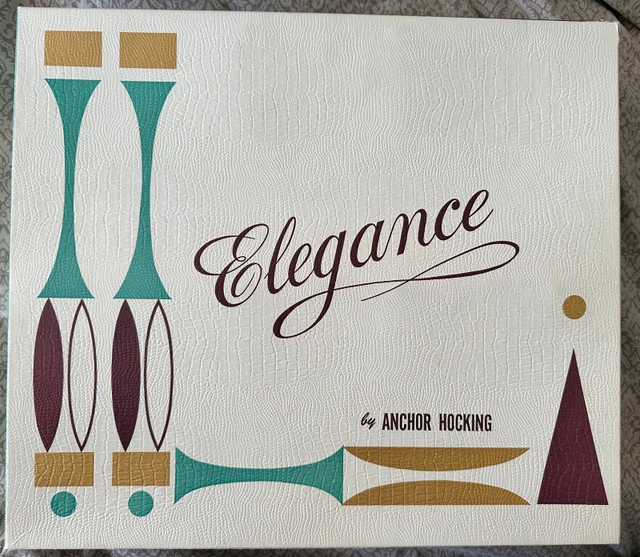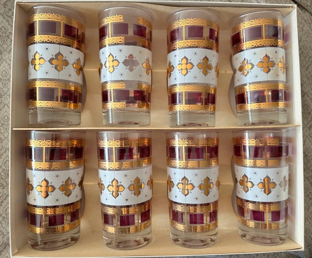 41New in box Anchor Hocking Elegance Drinking Glasses. These vintage (1950’s) drinking glasses are in excellent condition in the original box. The glasses are clear with a white, purple and gold pattern. This set of 8 was never used and are in the original box, stored in a cedar chest for many years. 8 x 12 ounce glasses. Asking $60 obo. Evening or weekend pick up only. Closest major intersection is Hurontario Street and Central Parkway in Mississauga.