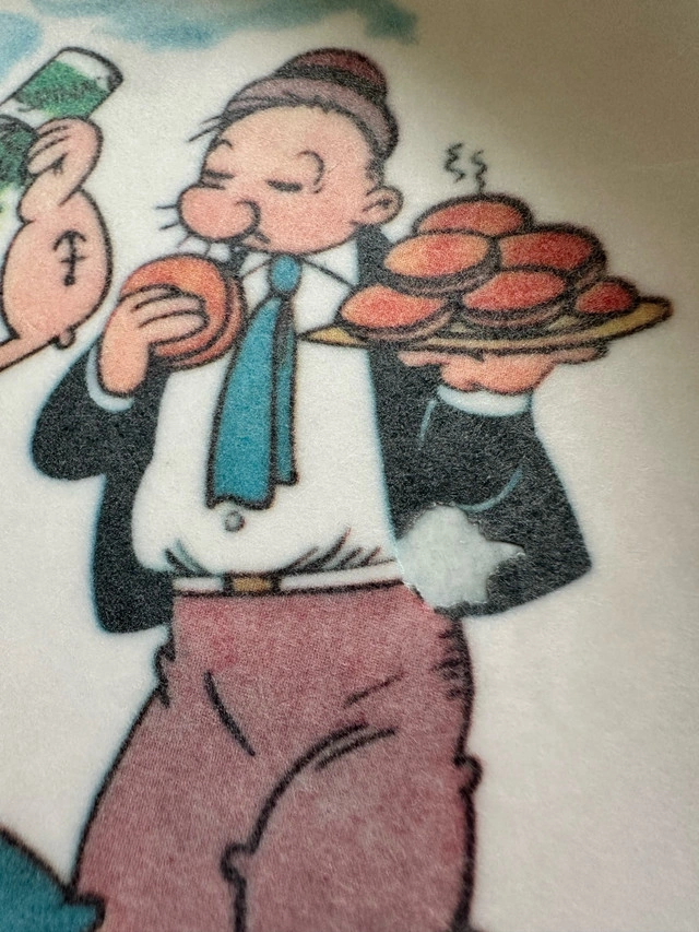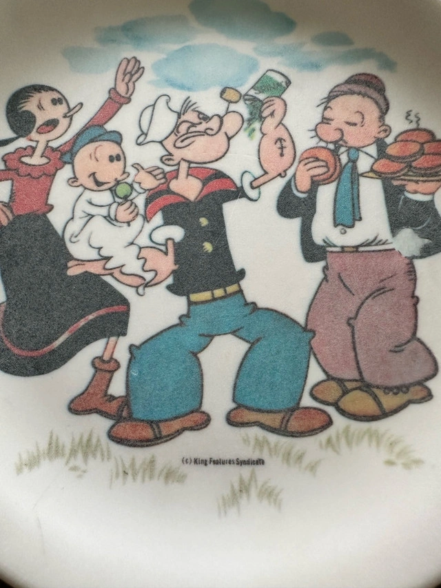 Vintage Popeye Child’s Plate - Melamine Plastic Dinner Plate Decorative TV Show Cartoon Illustration Collectible Snack Plate. Well used, some fading and small peel off spot (see pics).