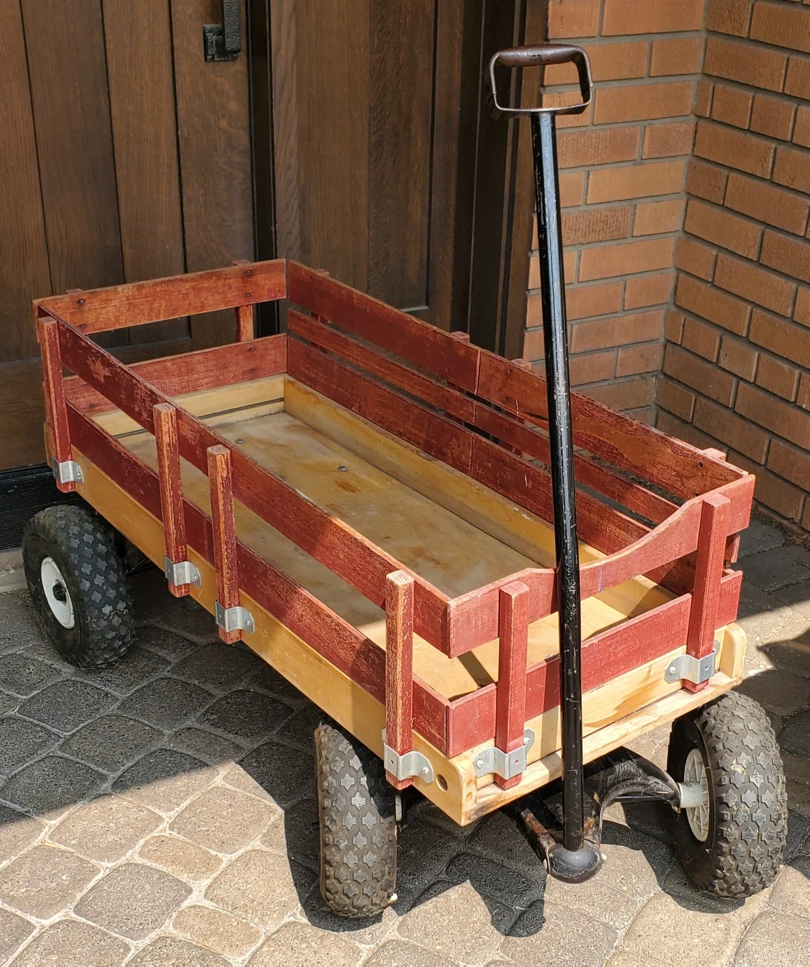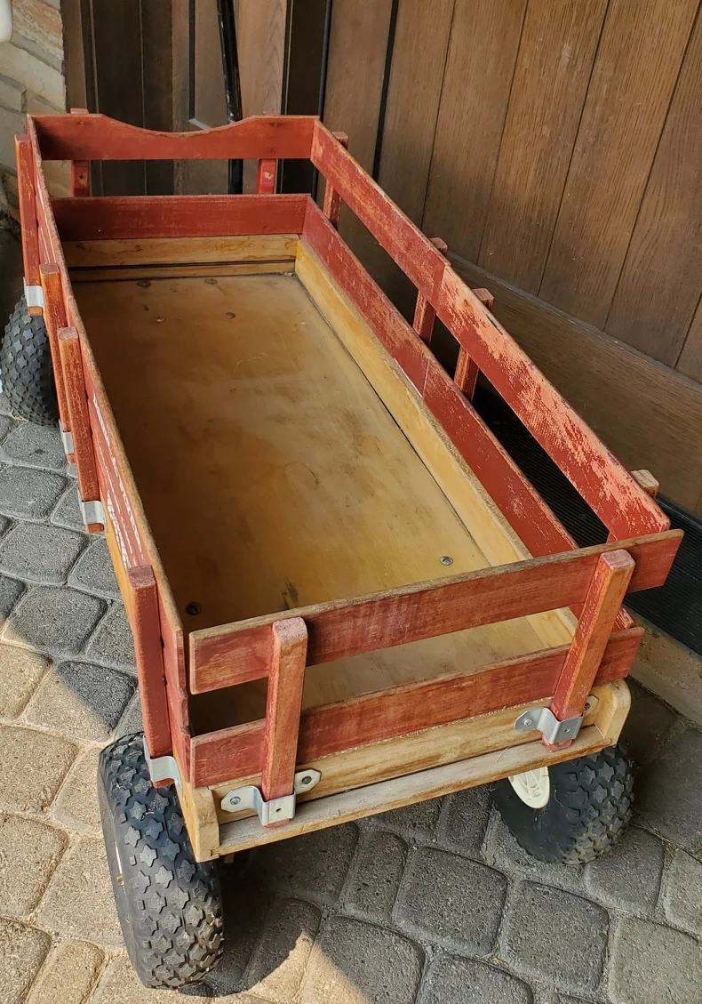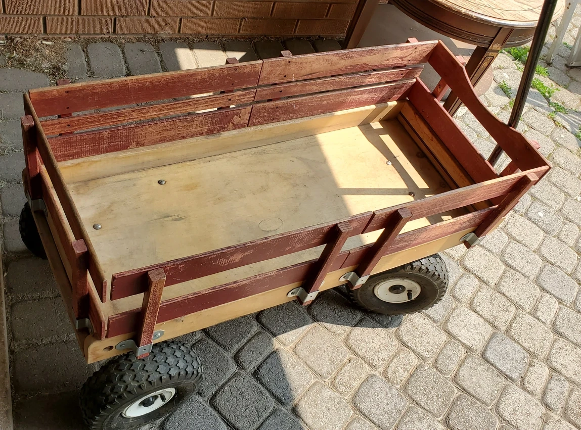 This wagon is in good condition no damage to wheels, axels, wagon base or sides. Some weathering to paint on sides and handle from normal use. Tires recently pumped, no air leaks. Easy to fill. Wagon turns and steers easily, tires function like new. Easy to pull. Sides can be removed and replaced easily to allow for versatility of use.
