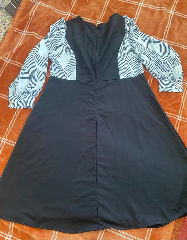 Stunning midi dress. Features a black bodice and a patterned white and black three-quarter sleeve. A-line silhouette. Button closure at the back.