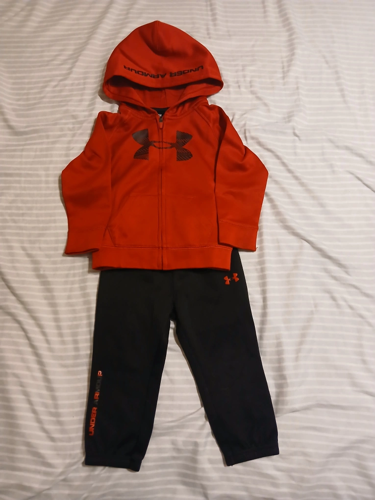 Toddler Under Armour two-piece tracksuit in red and black. Size 24 months. In excellent shape: other than some light wear on the text on the pants, it’s in giftable shape.