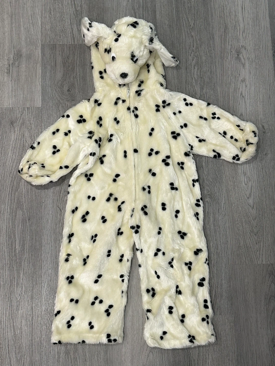 Super cute Dalmatian dog costume! It's in great condition and perfect for dress-up or Halloween. The costume is a soft, plush material with black spots all over. It features a hood with a Dalmatian dog head. Your little one will love it!