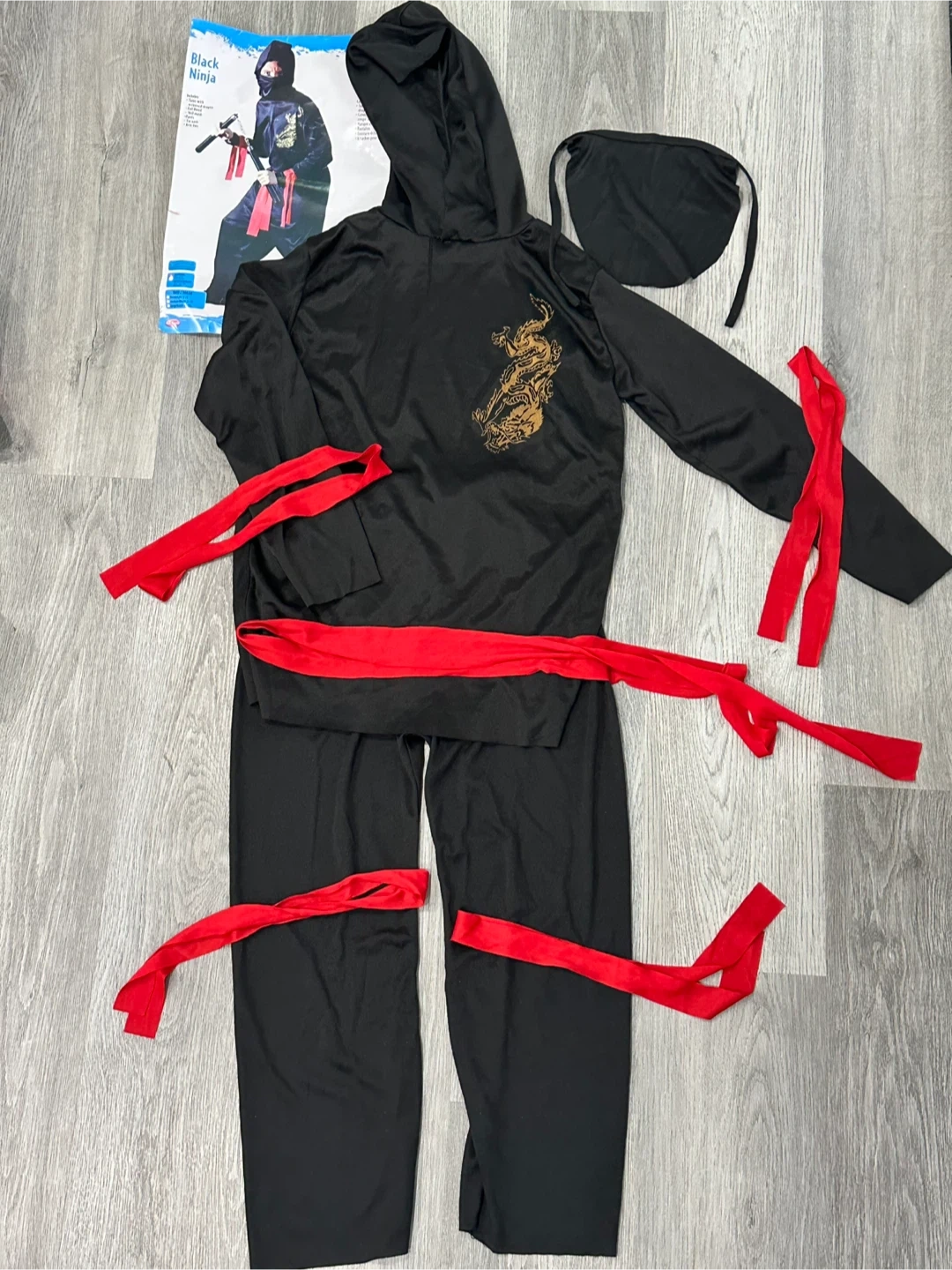 Selling a black ninja costume. It comes with the hooded top, pants, face covering and red sash. Perfect for Halloween or dress up!
