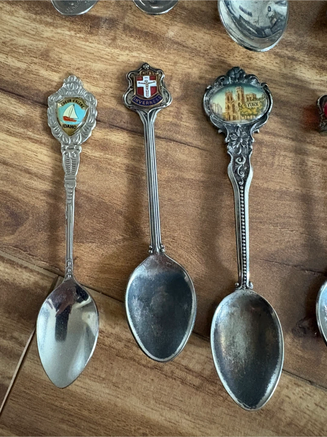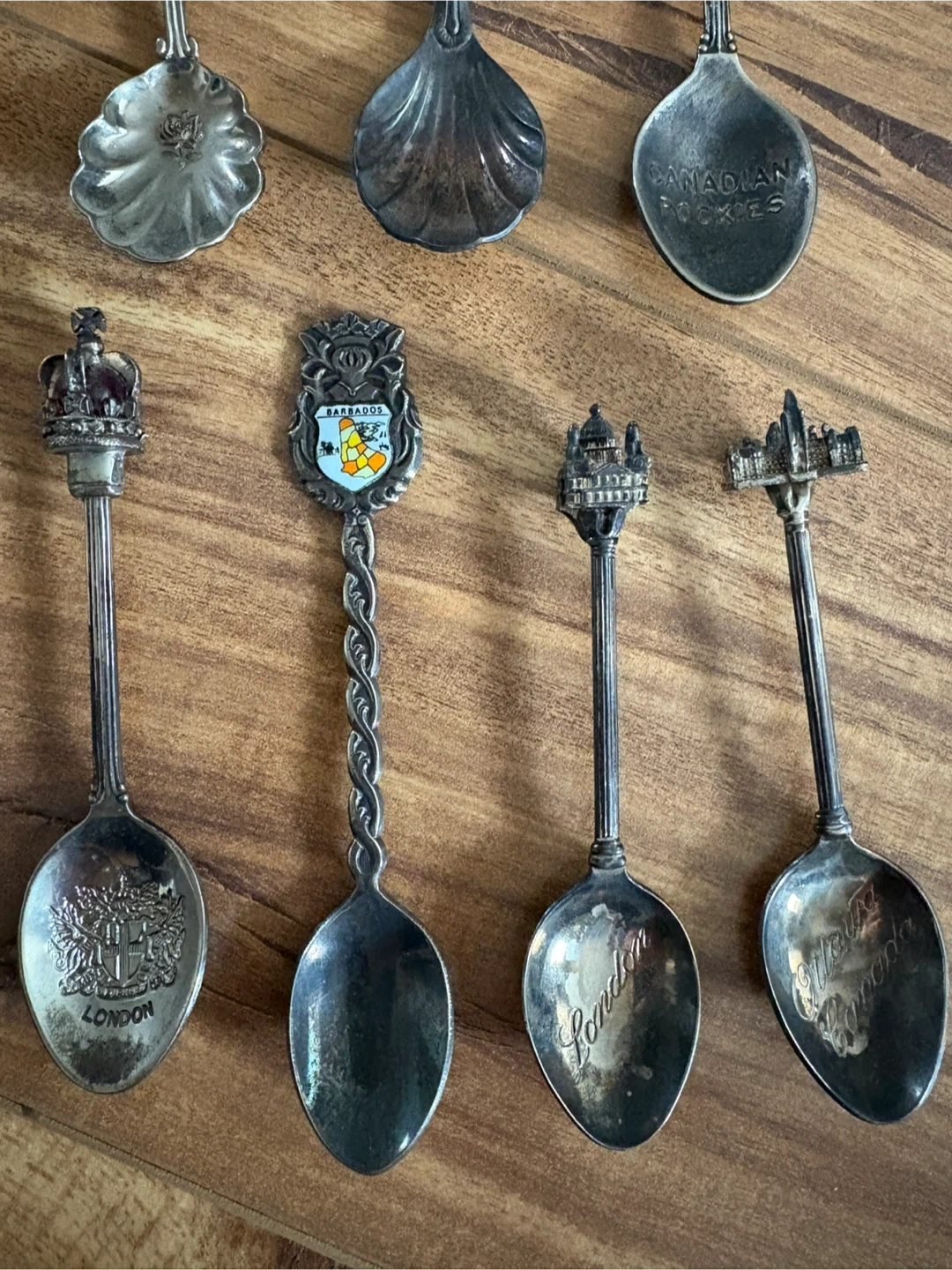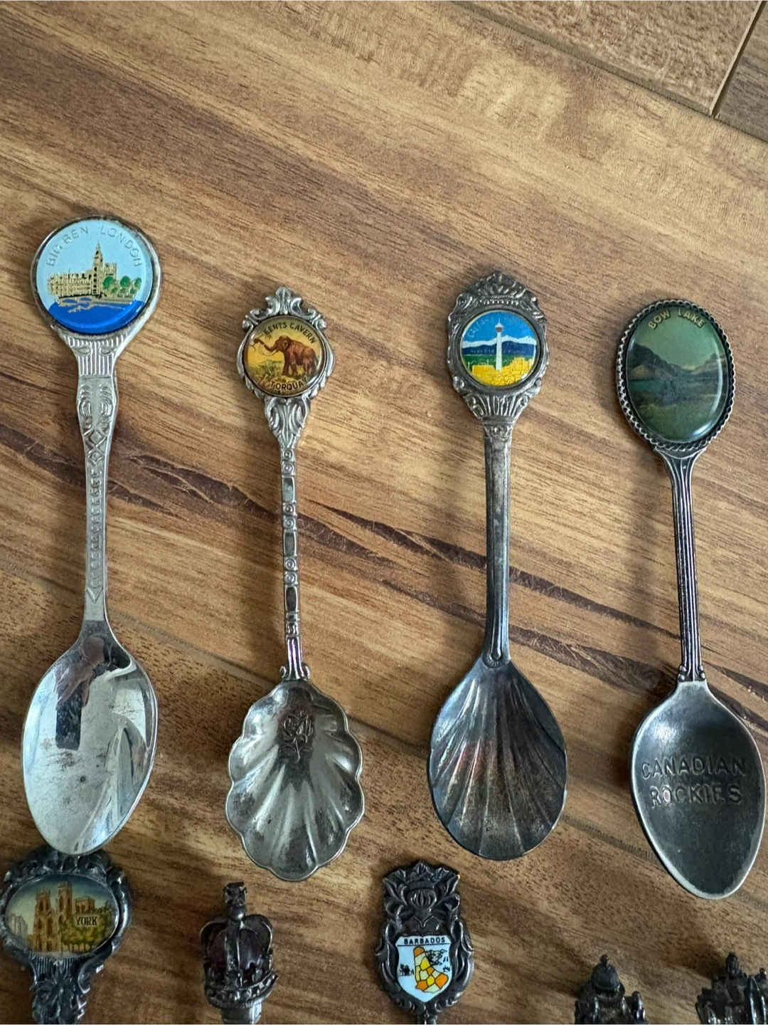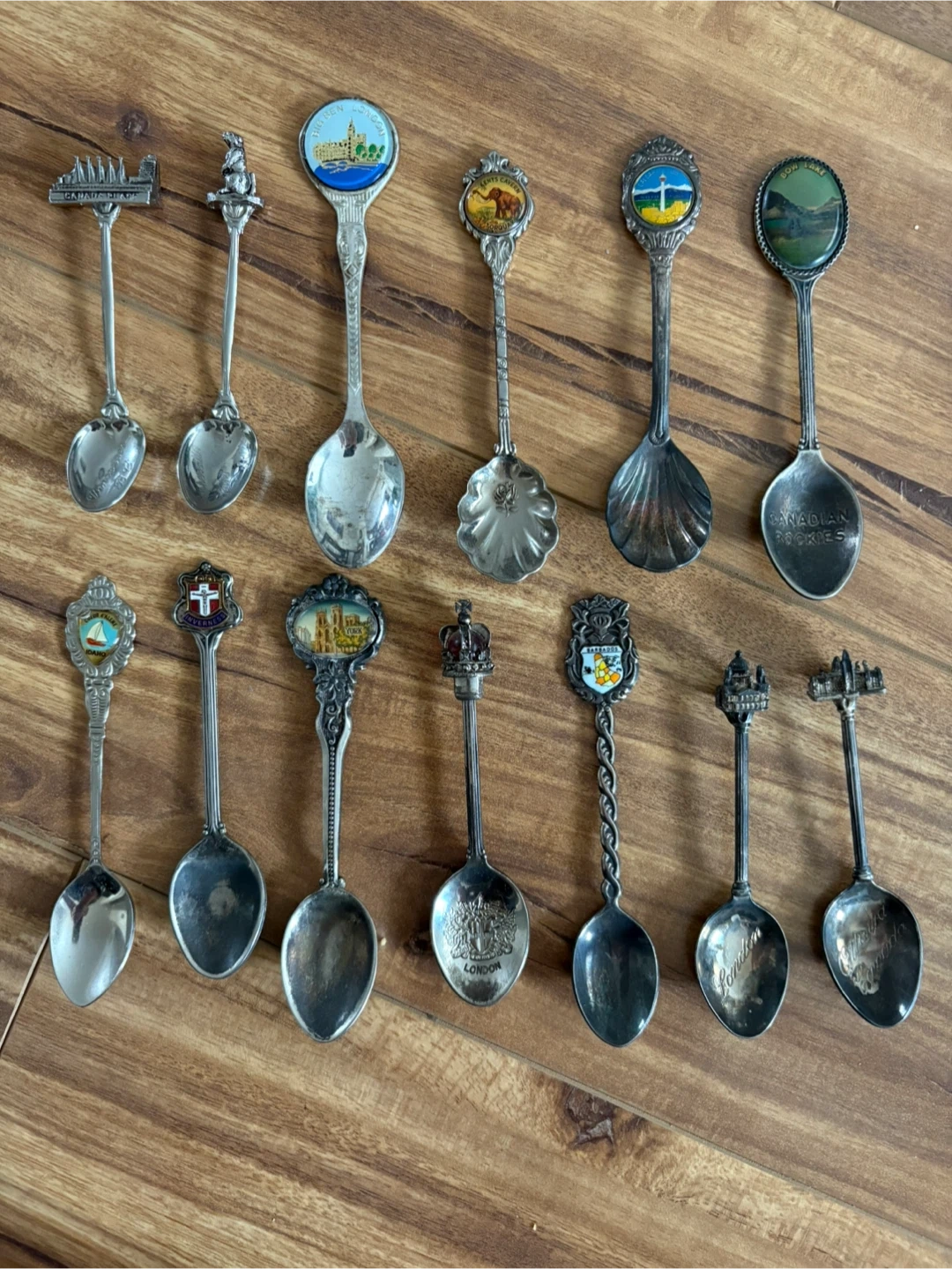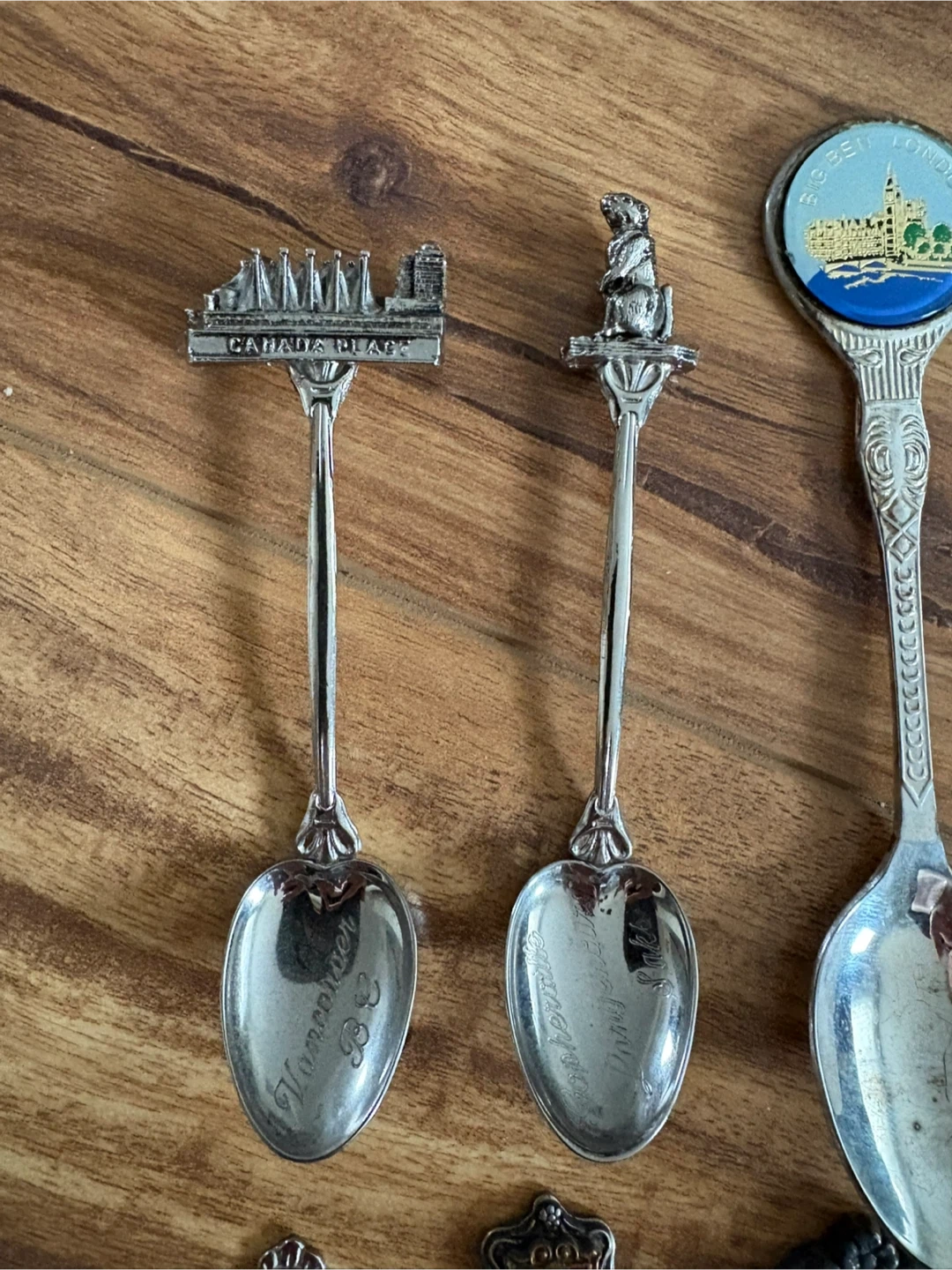 Selling a collection of 13 vintage souvenir spoons from various locations, including London, Canadian Rockies, and Barbados. Each spoon features a unique design representing its location. Great for collectors or as a decorative piece! $25.00 for the set. Pick up in Confederetion mall or Kensington area.
