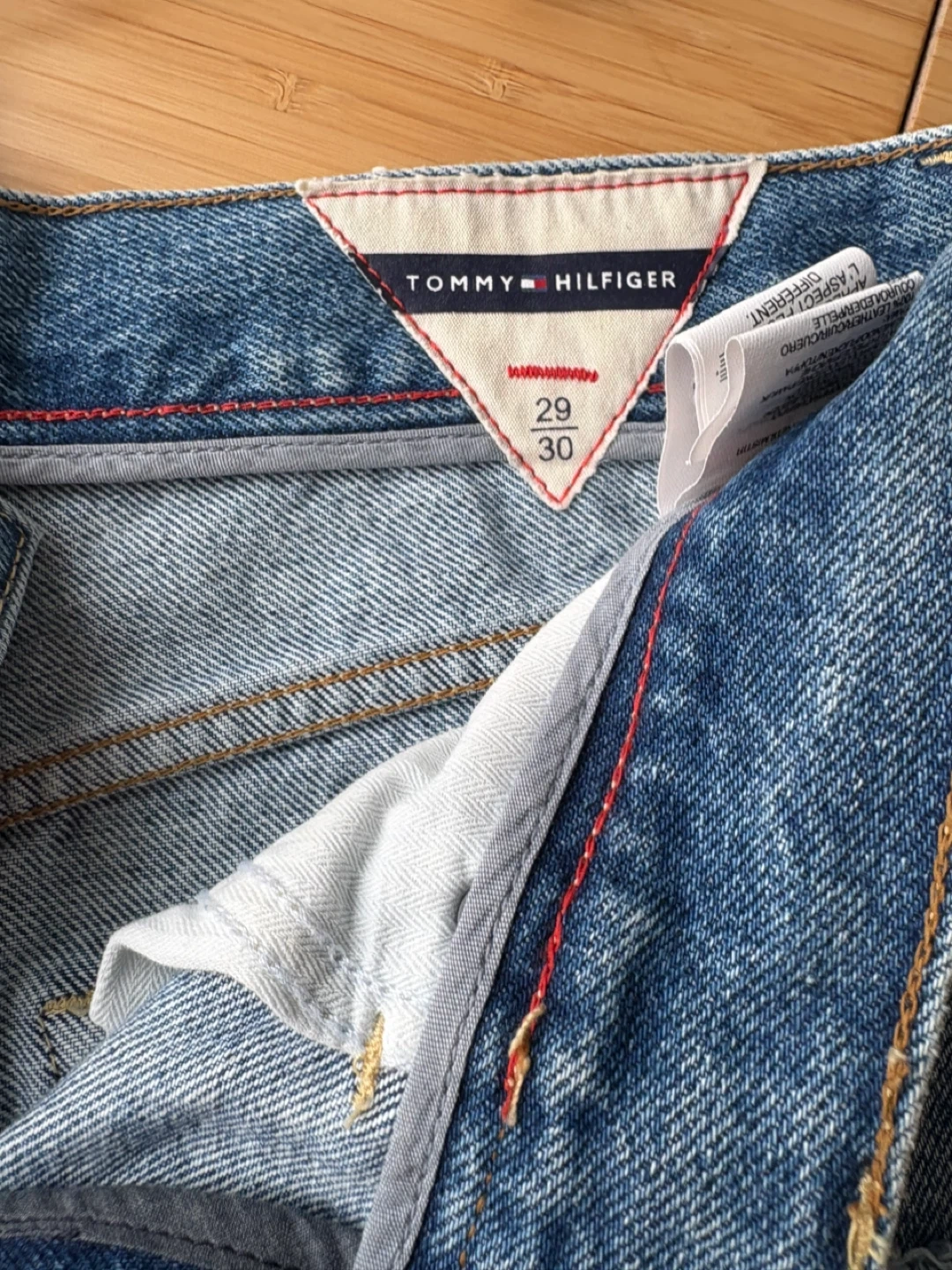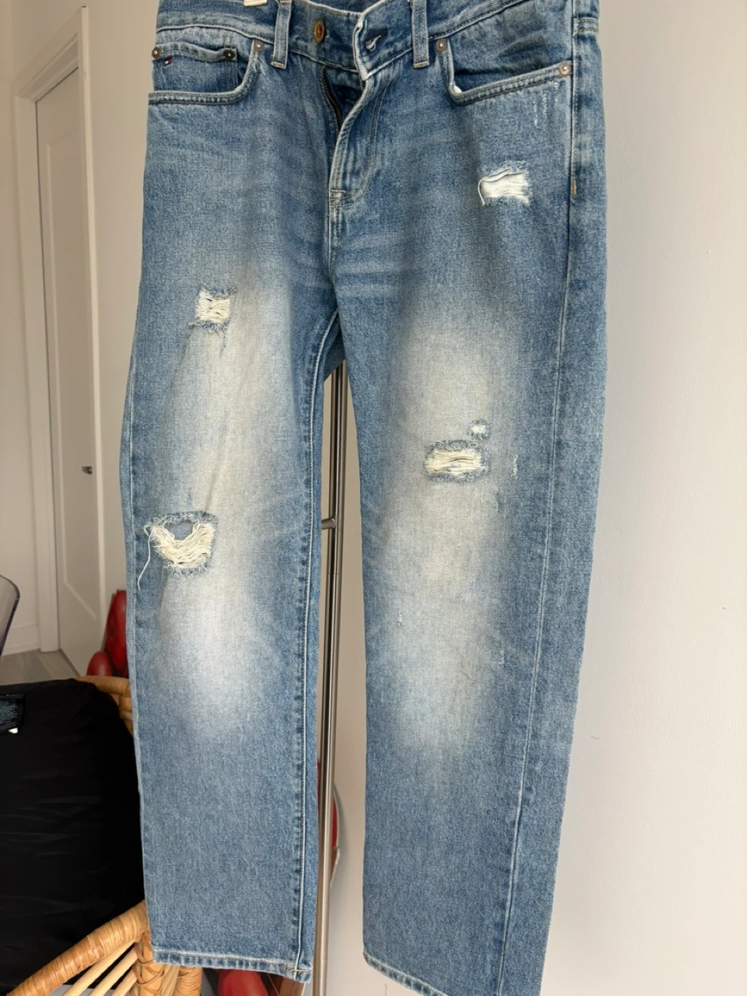 Tommy Hilfiger jeans in size 29/30. These jeans are in good condition and have a stylish, distressed look with some rips. Perfect for a casual, everyday outfit!