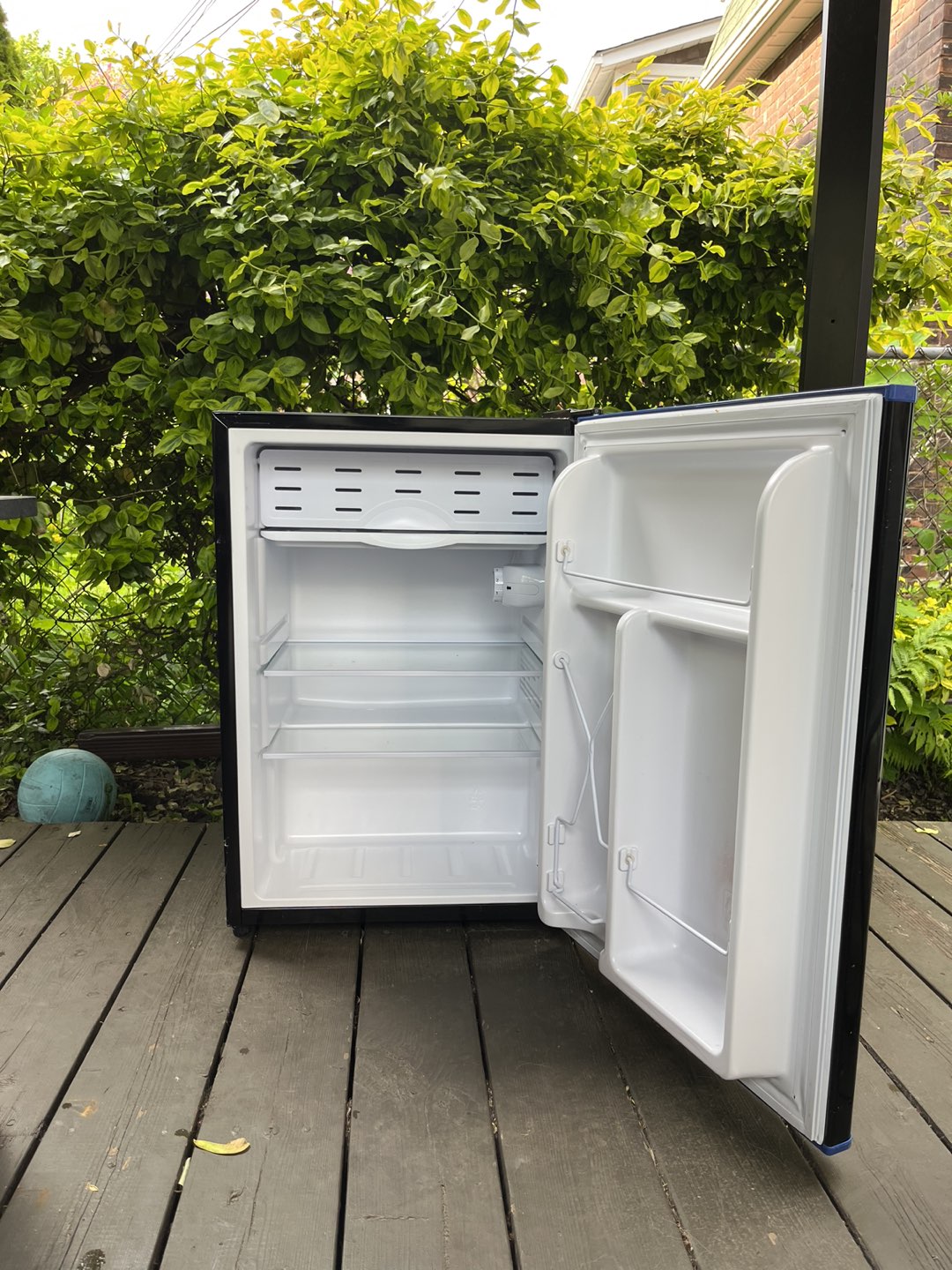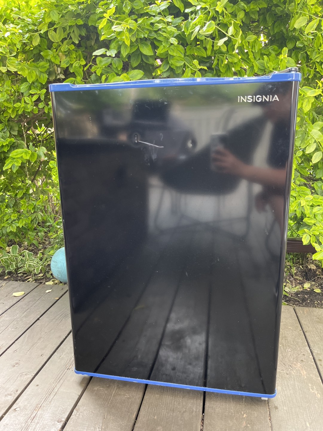 15Black Insignia mini fridge. In fair condition, I’m trying to get rid of this. It has an adjustable temperature with 7 different temperatures. It is a standard plug shown in picture 6. A new fridge cost 300-400 dollars