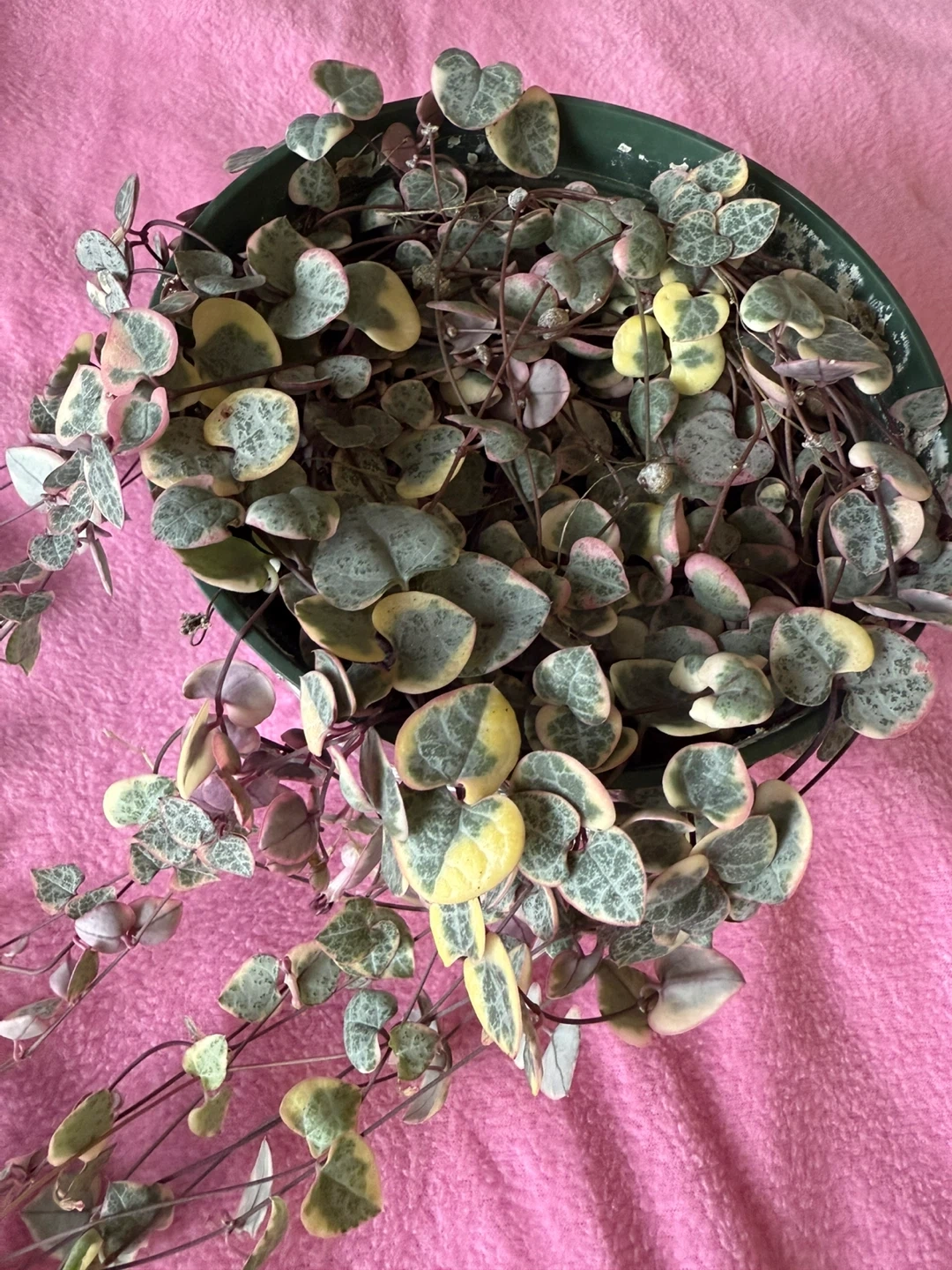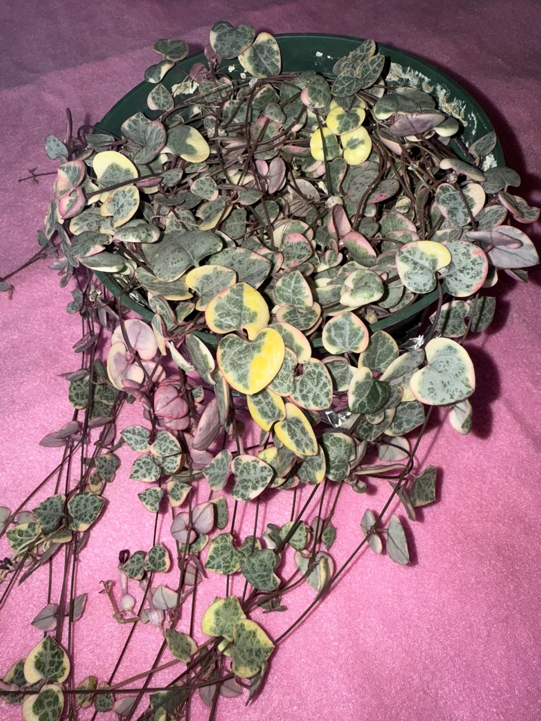A beautiful variegated string of hearts plant! The leaves have lovely patterns of green, yellow, and pink. It's perfect for hanging or placing on a shelf where the trailing vines can cascade down.