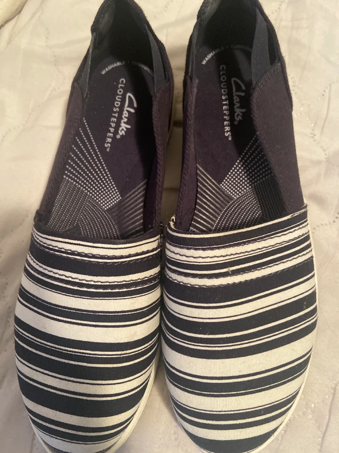 Selling a pair of Clarks Cloudsteppers Breeze Step shoes in size 7.5. They feature a stylish navy and white striped design. These shoes are designed for comfort with a cushioned insole and are washable. Perfect for everyday wear!
