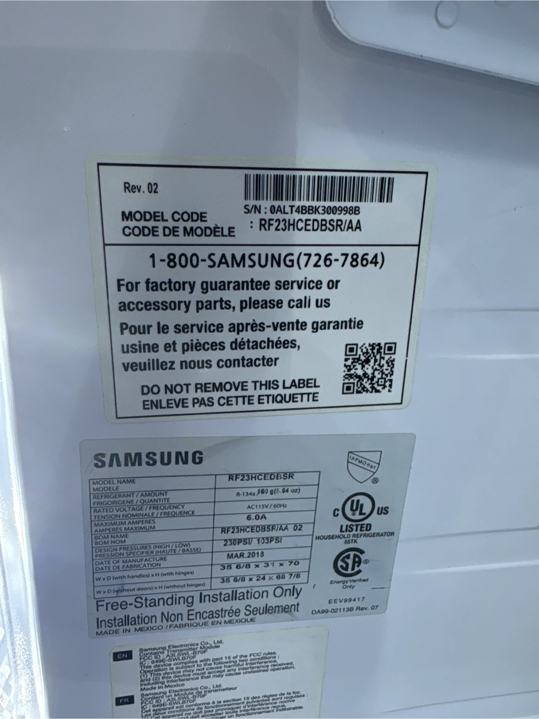 Selling a Samsung refrigerator, model number RF23HCEDBS. It's in great working condition and ready to keep your food fresh! The model code is RF23HCEDBS/AA. Dimensions are approximately 35 5/8 x 31 x 70 inches.