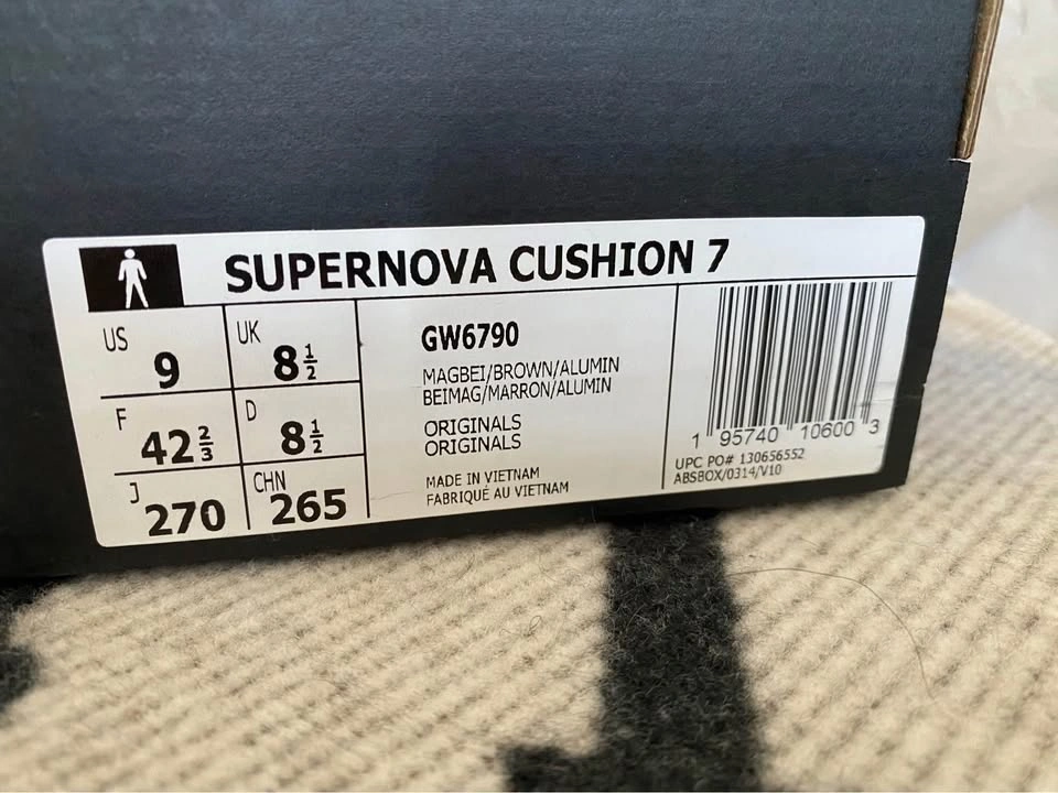 66Step into retro style with these brand new unworn Adidas Supernova Cushion 7 running sneakers, size 9 US. Featuring a unique beige, brown, and green colourway, these shoes combine vintage aesthetics with modern comfort. The Supernova Cushion 7 is perfect for adding a distinctive touch to your athletic or casual wear. * Brand: Adidas * Model: Supernova Cushion 7 * Size: 9 US men’s * Colour: Beige/Brown/Green * Condition: New with box unworn condition Available? Absolutely! If you're reading this, the sneakers are still waiting for their next adventure.