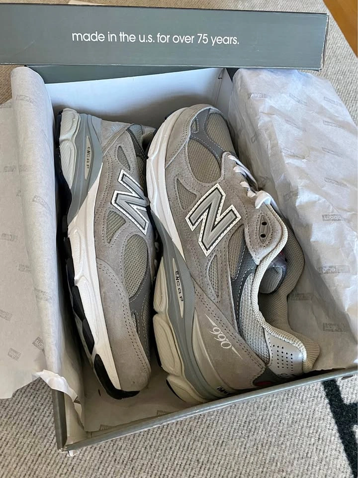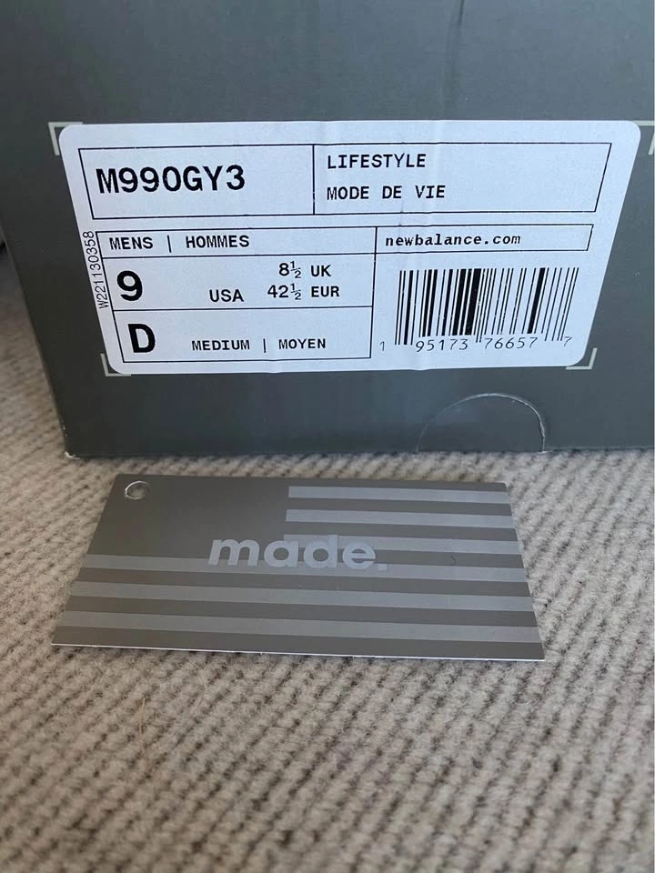 66I'm selling a pair of New Balance 990V3 sneakers in US size 9. These stylish and comfortable shoes feature a classic design with a grey colourway, perfect for everyday wear. Made in the USA, they boast exceptional quality and durability. The shoes are in good condition, as you can see from the photos. Note that they have been worn, so they are not in new condition. Size US 9 men’s. With Box ans Papers Additional features include: 100% authentic with receipt. Brand new unworn condition * ENCAP midsole for cushioning * Suede and mesh upper for breathability * Durable rubber outsole for traction * Classic New Balance Grey Color If the ad is up, they're available! Don't be shy; these shoes are waiting to step into your life – or at least your wardrobe!