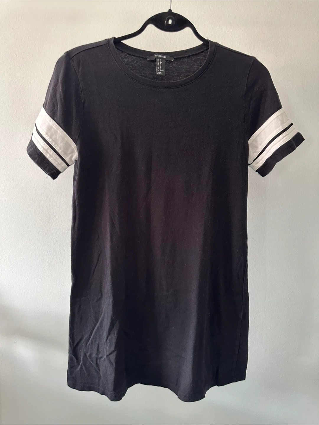 Selling a cute Forever 21 t-shirt dress! It's black with white stripes on the sleeves and is a size small. In great condition and ready for a new home!