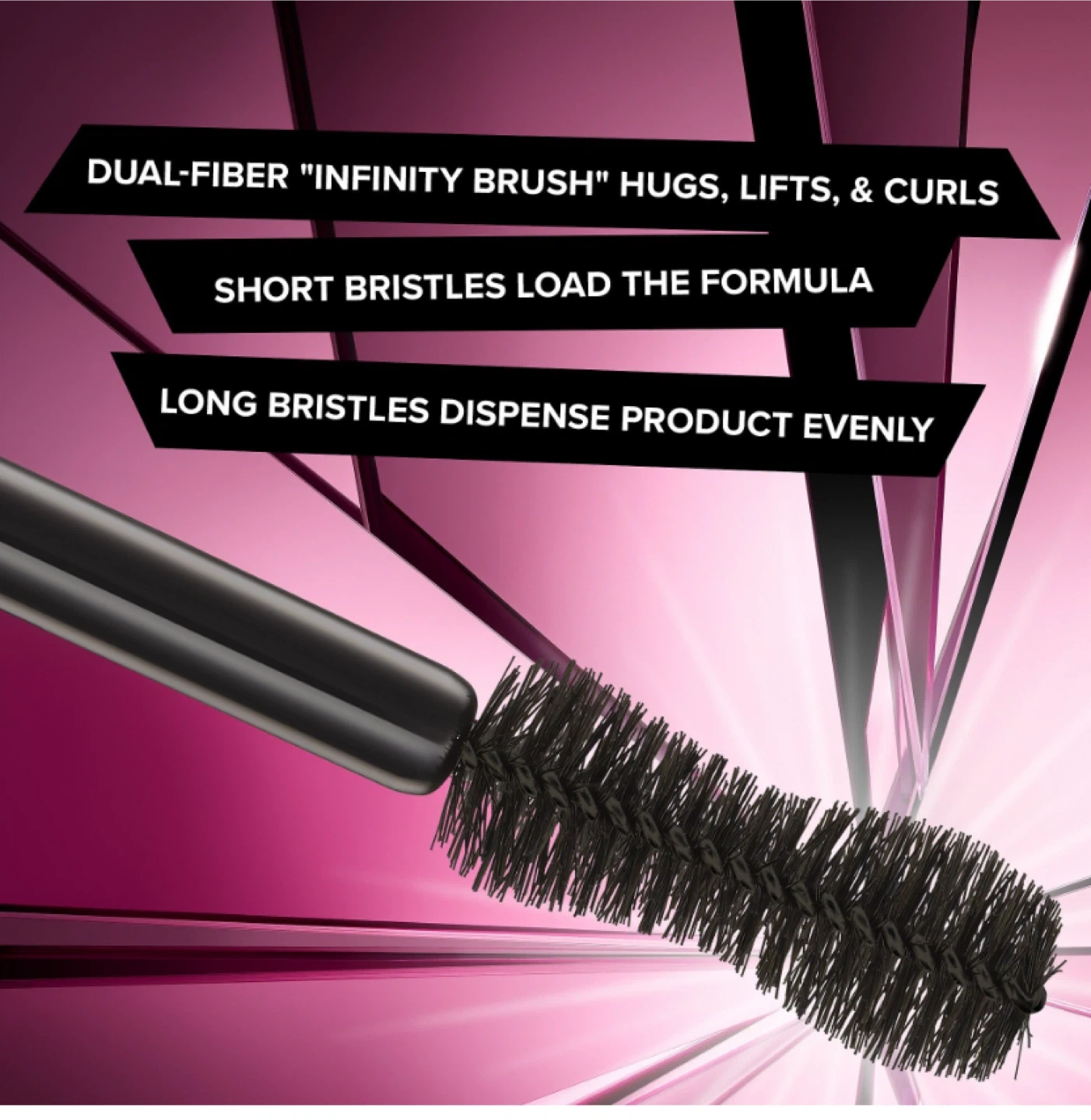 The dual-fiber "infinity brush" hugs, lifts, and curls your lashes. Short bristles load the formula, while long bristles dispense the product evenly