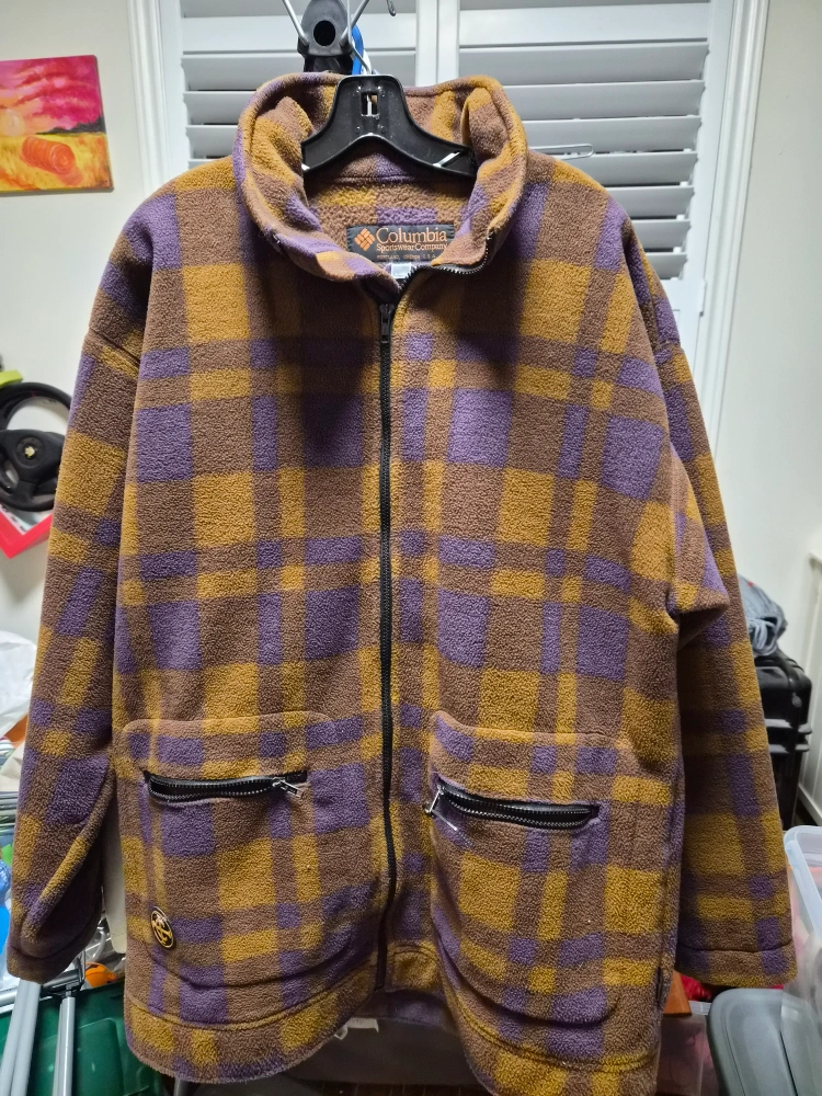 53Cozy Columbia fleece jacket in a unique brown and purple plaid pattern. It features a full zip and handy pockets. Perfect for staying warm on chilly days!