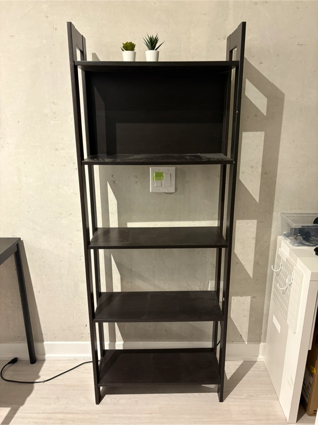 Selling a black ladder bookshelf with 5 shelves. It's in great condition and ready to add some storage to your space. Perfect for books, plants, or decor!