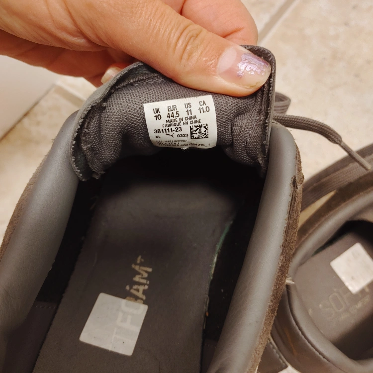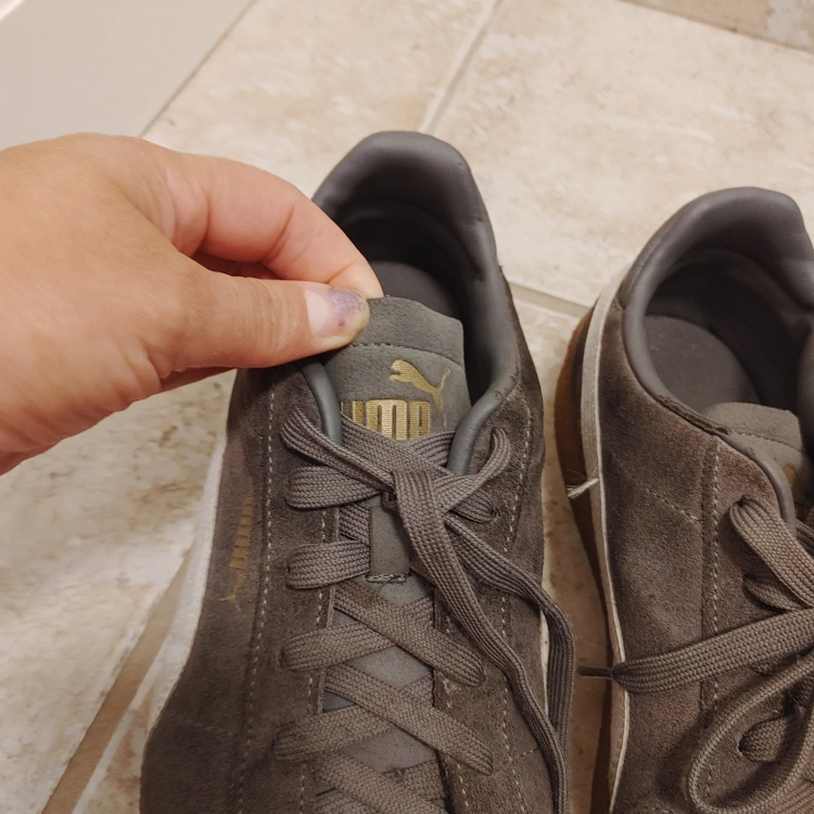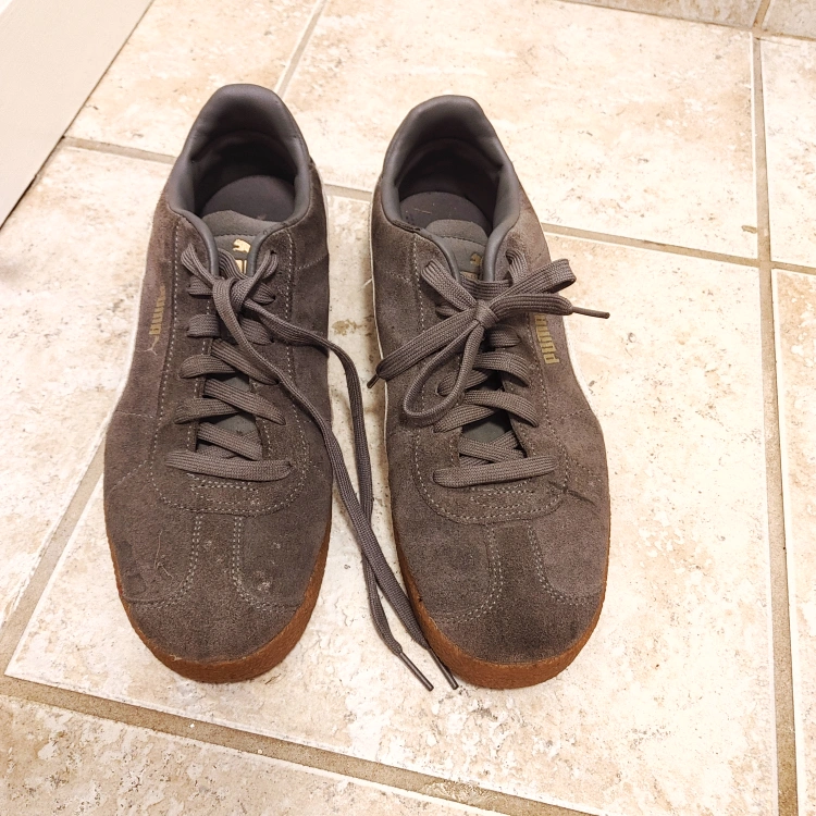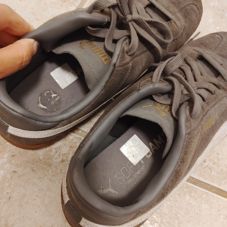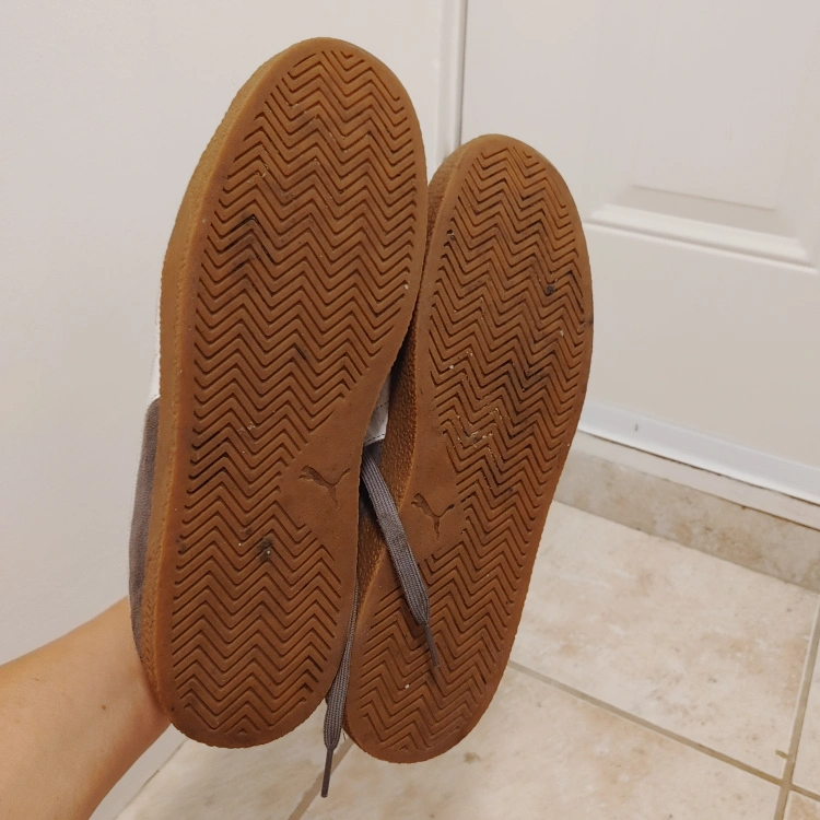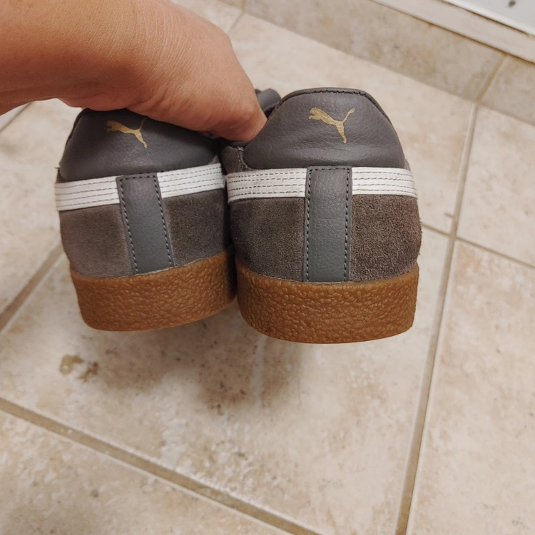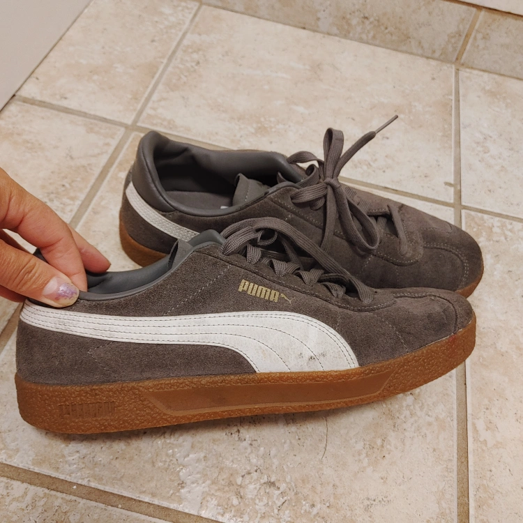 Selling a pair of Puma suede sneakers in grey. They have a white stripe and a gum sole. The shoes are in good condition
