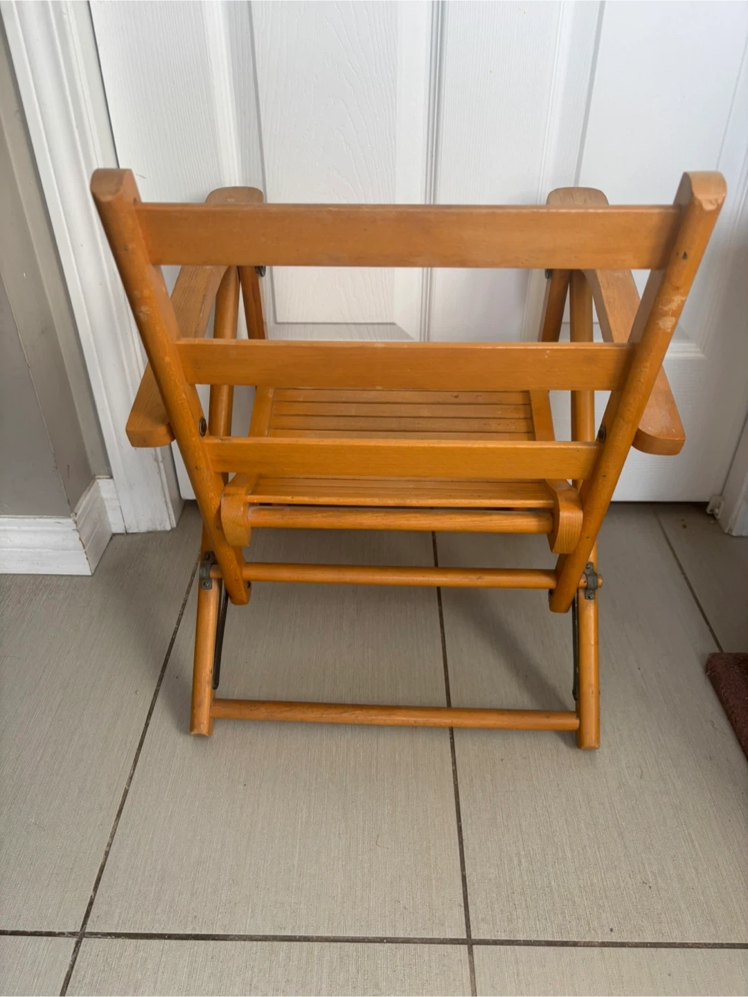 A cute wooden folding chair for kids! It's in good condition and perfect for indoor or outdoor use. The chair folds easily for storage or transport, making it super convenient for small spaces or taking on the go