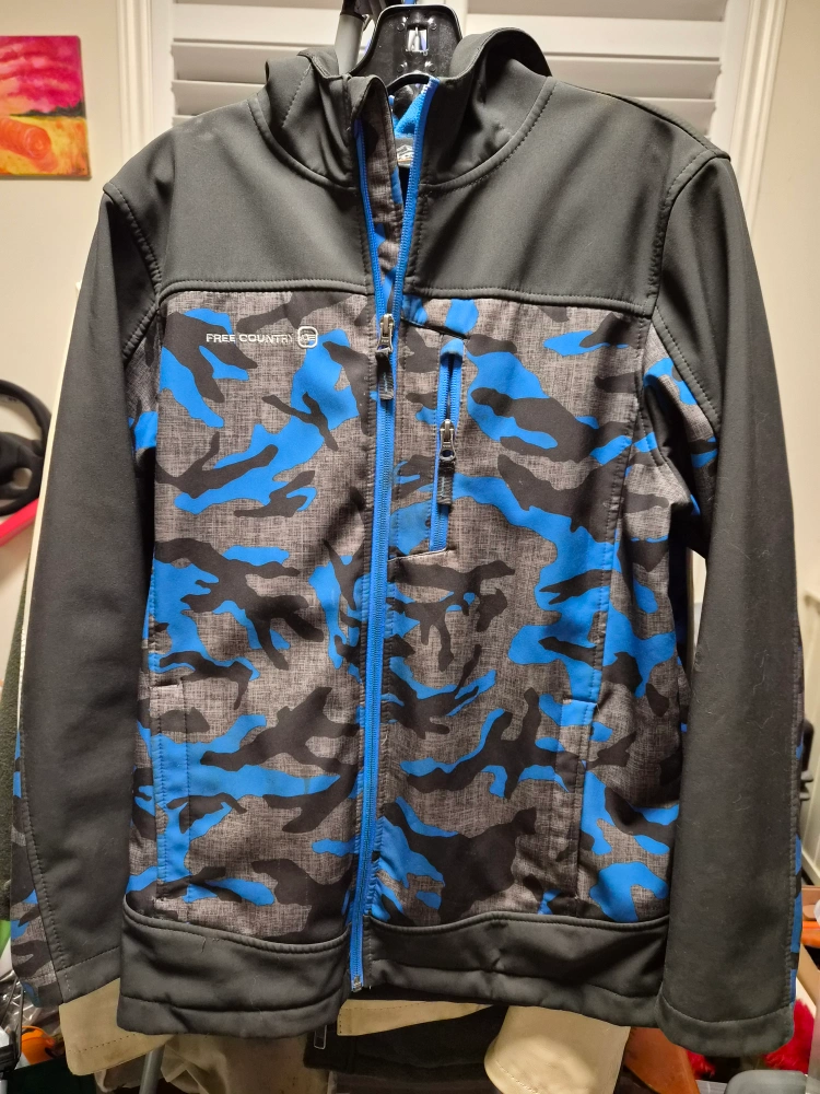 Here's a Free Country softshell jacket in a cool blue camouflage pattern. It's in great shape and ready for a new home!